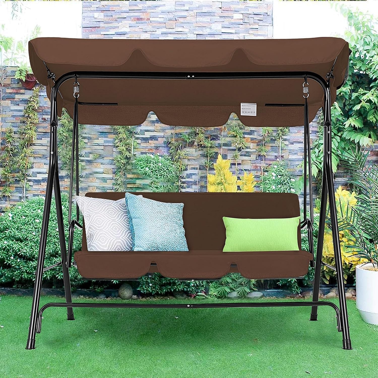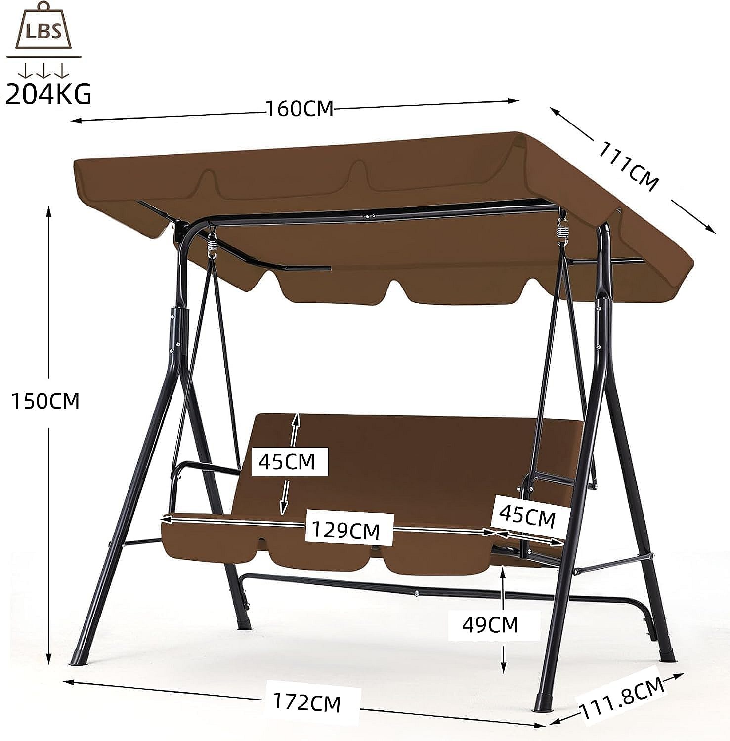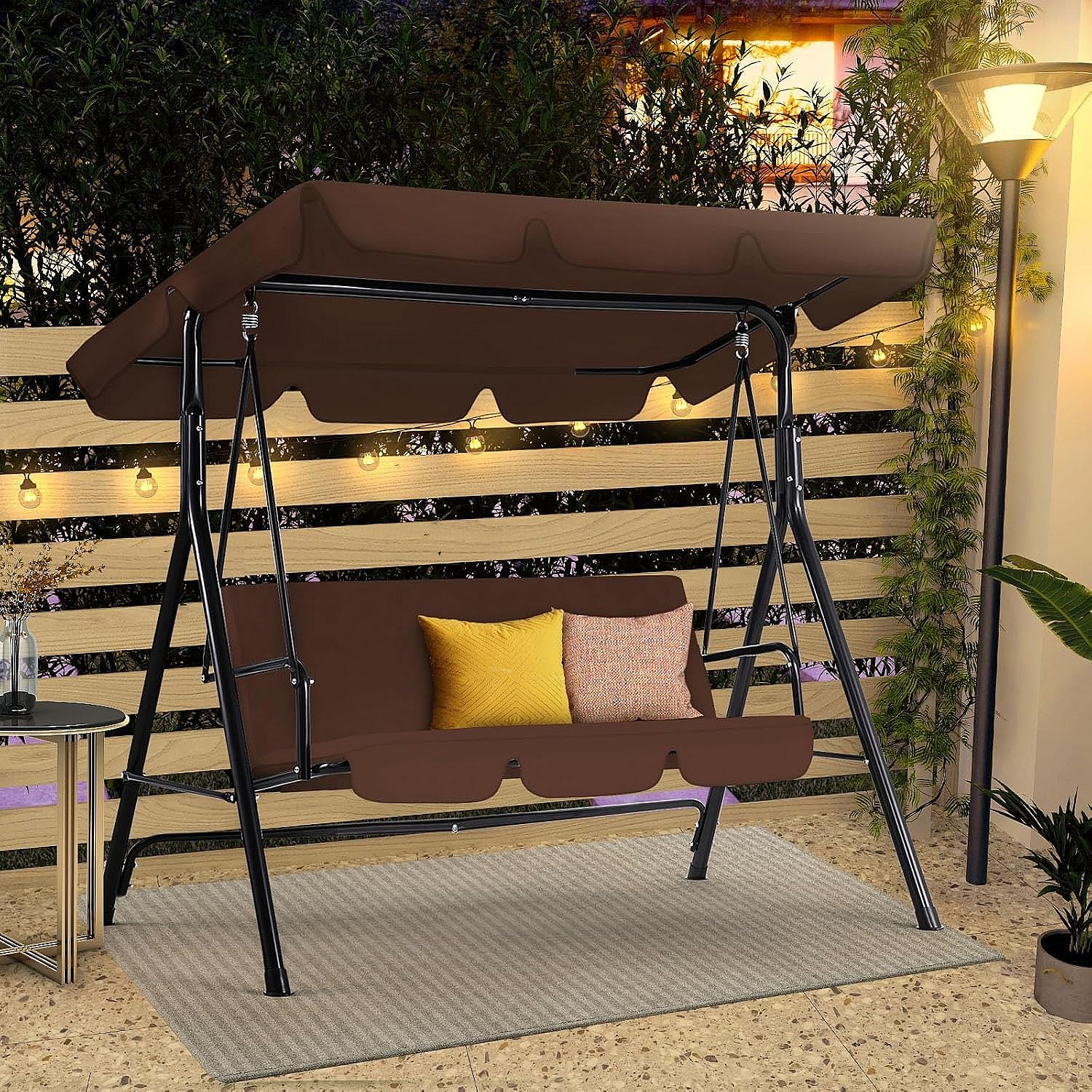 YODOLLA 3-Sitzer Hollywoodschaukel mit verstellbarem Vordach & abnehmbarem Kissen,Anti-Rutsch-Füßen -172x112x150 cm - Für Garten,Terrasse und Poolbereich,Braun