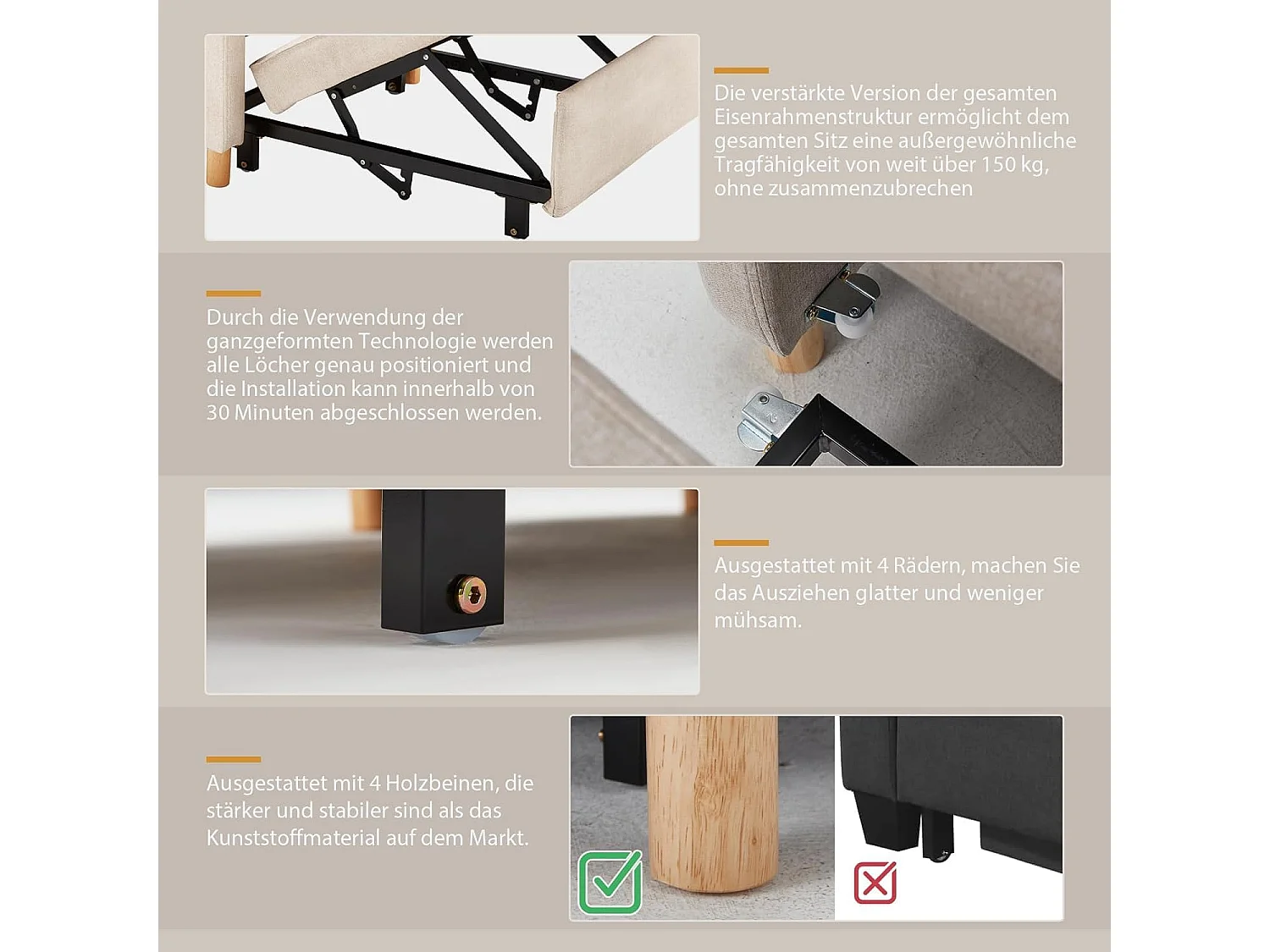 YODOLLA Einzel-Sofa, Bett, Stuhl, 3-in-1-Sessel, wandelbar, verstellbare Stühle, Bett für kleine Räume mit Seitentasche,Beige