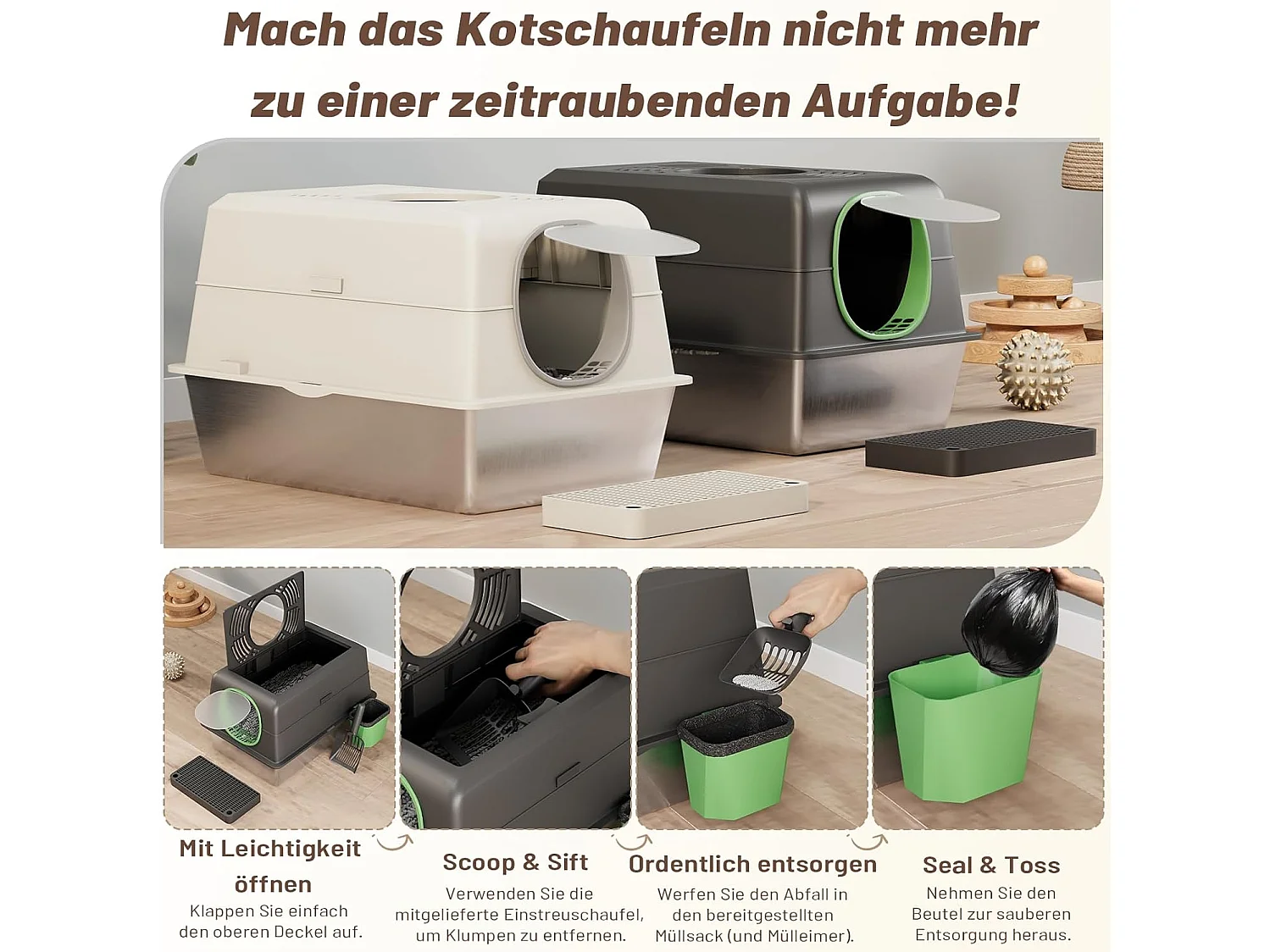 YODOLLA Katzentoilette, Edelstahl Katzenklo mit Deckel, Schaufel und Pedal, Dichtesign für Große Katzen, 60x40x38cm, Schwarz