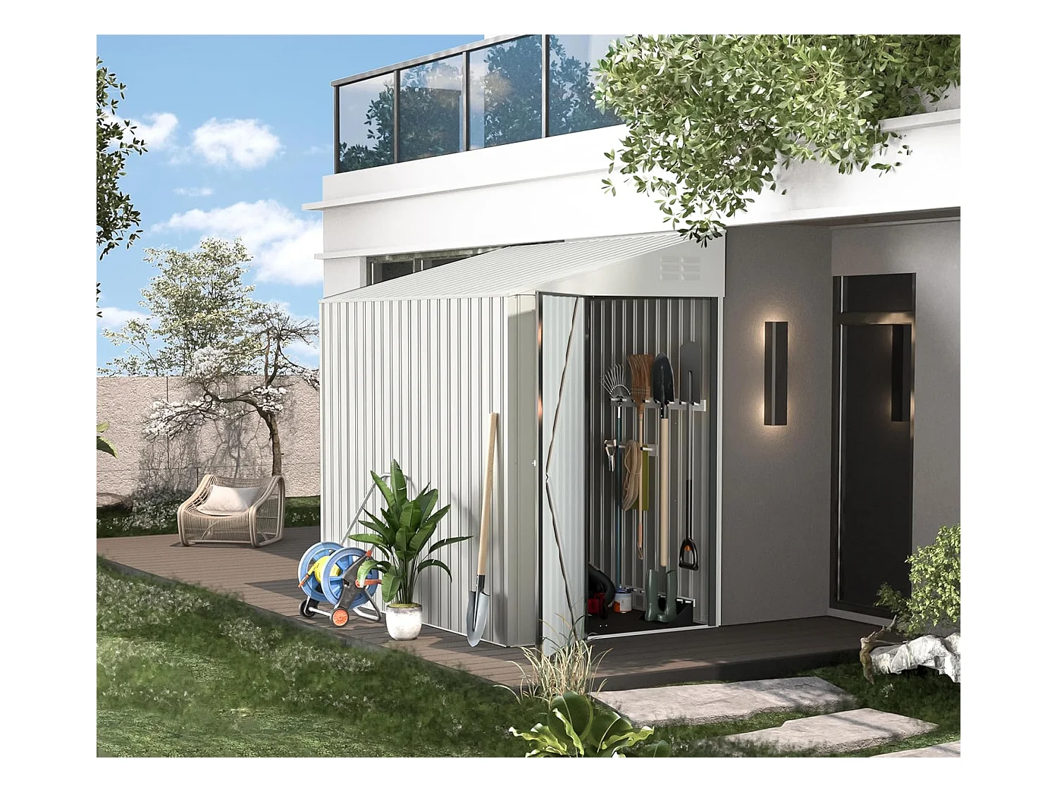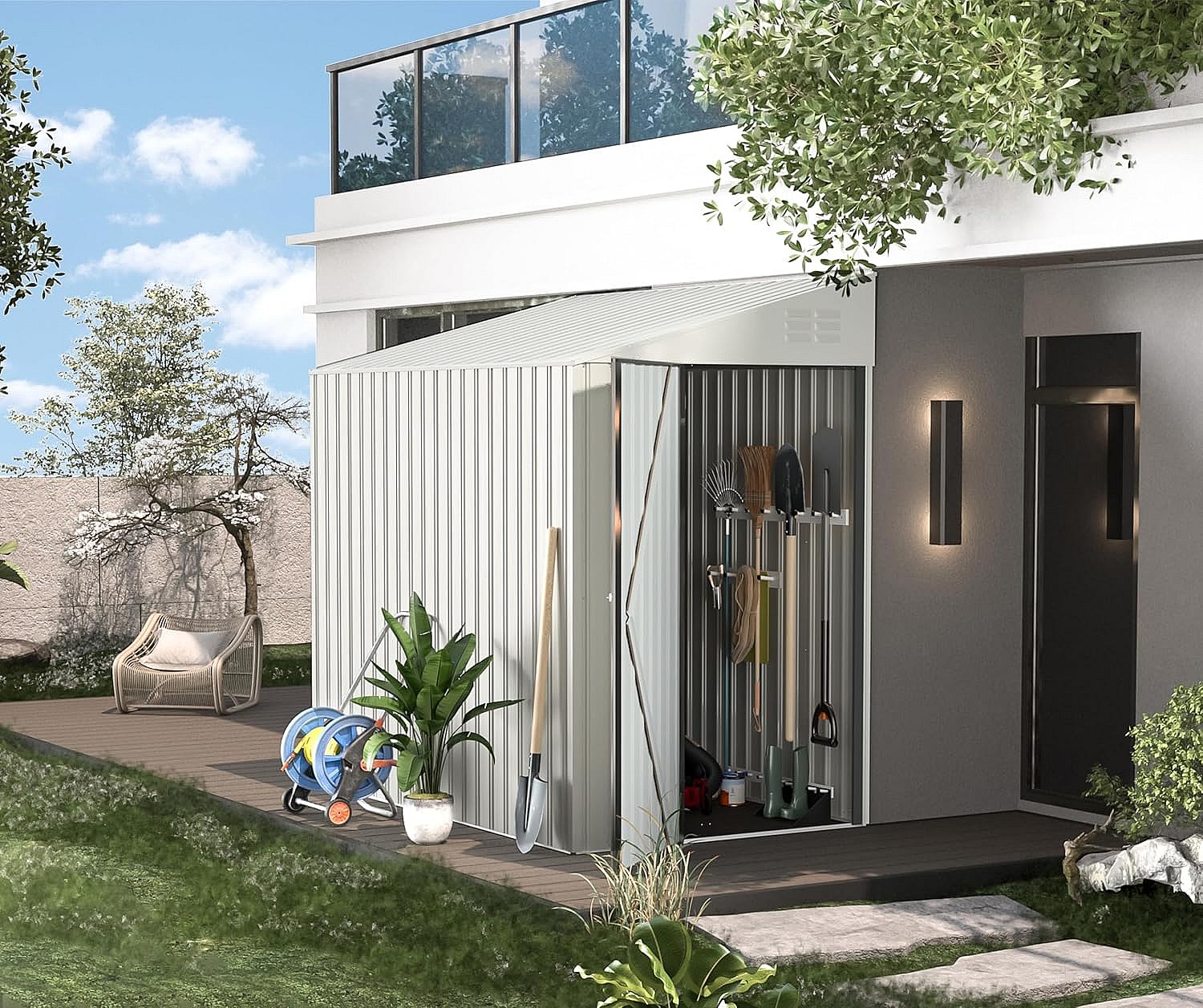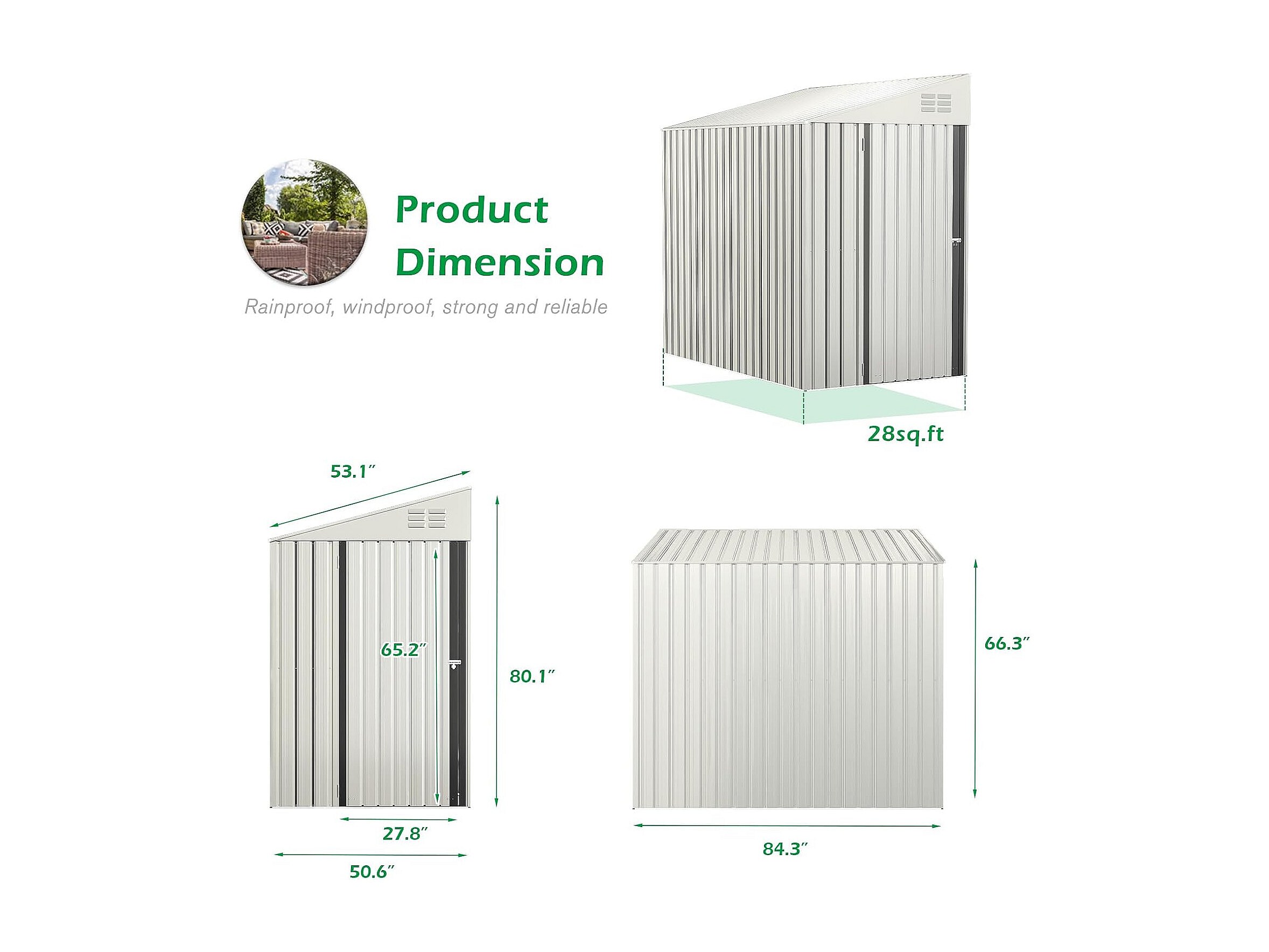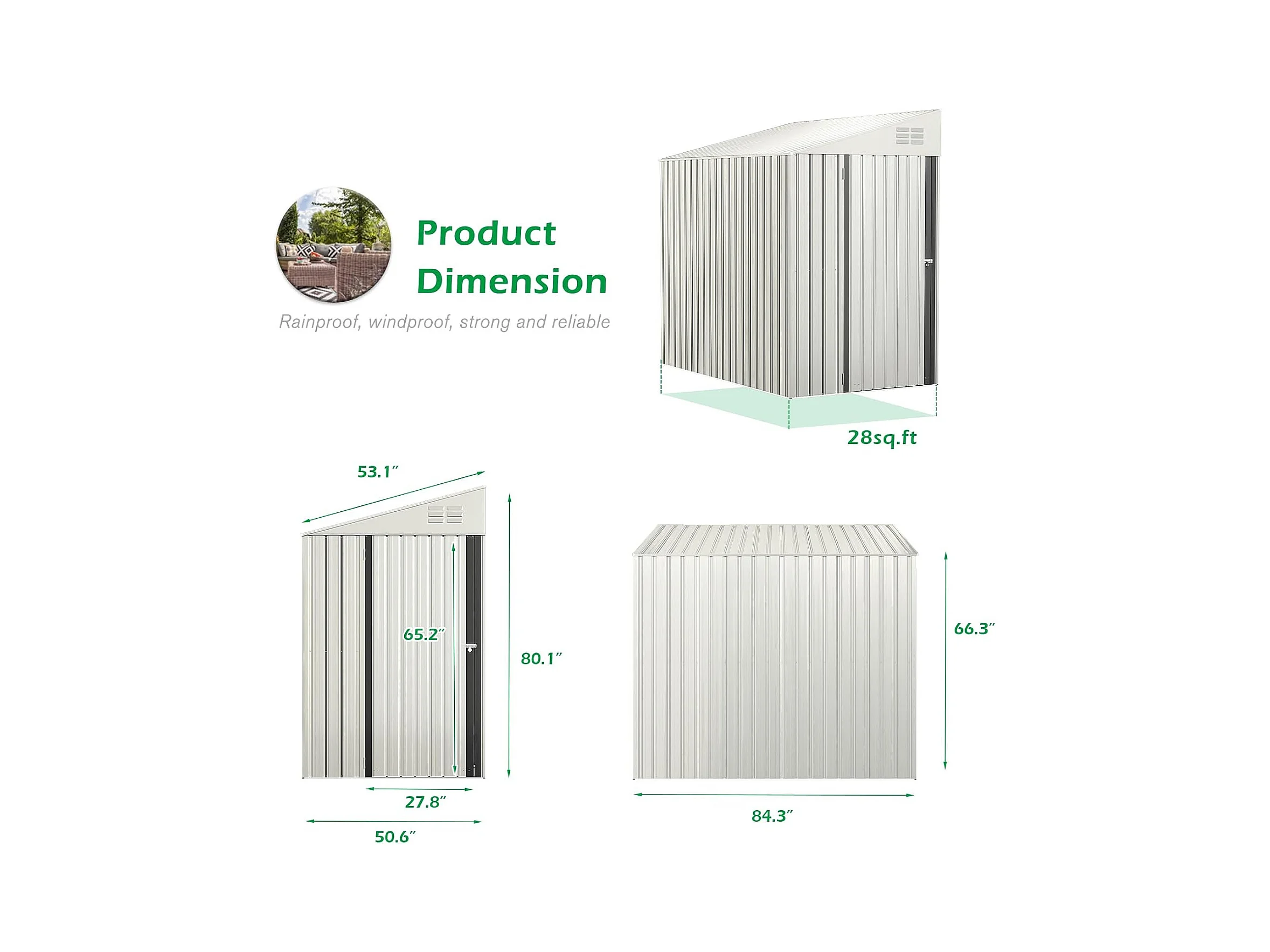 YODOLLA Metall-Anlehnschuppen,214x129x203cm Leicht aufzubauender mit schrägem Dach, Metall Gerätehaus für Außenlagerung,Wandanschluss-Schuppen für Garten,Weiß