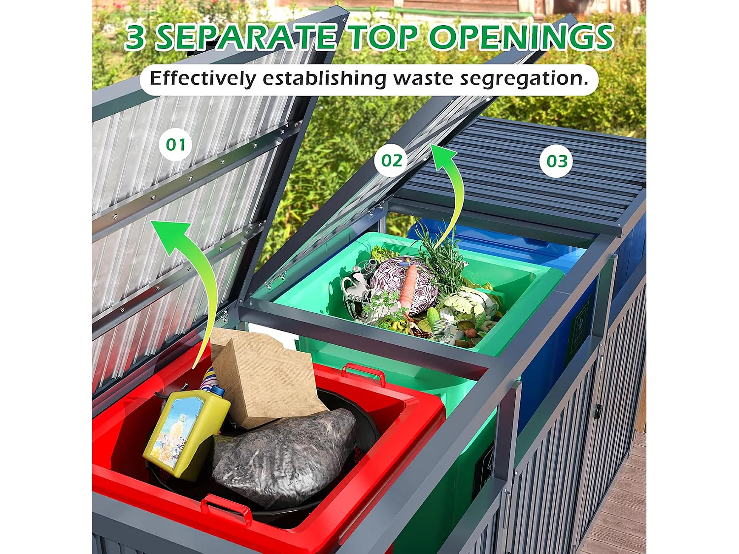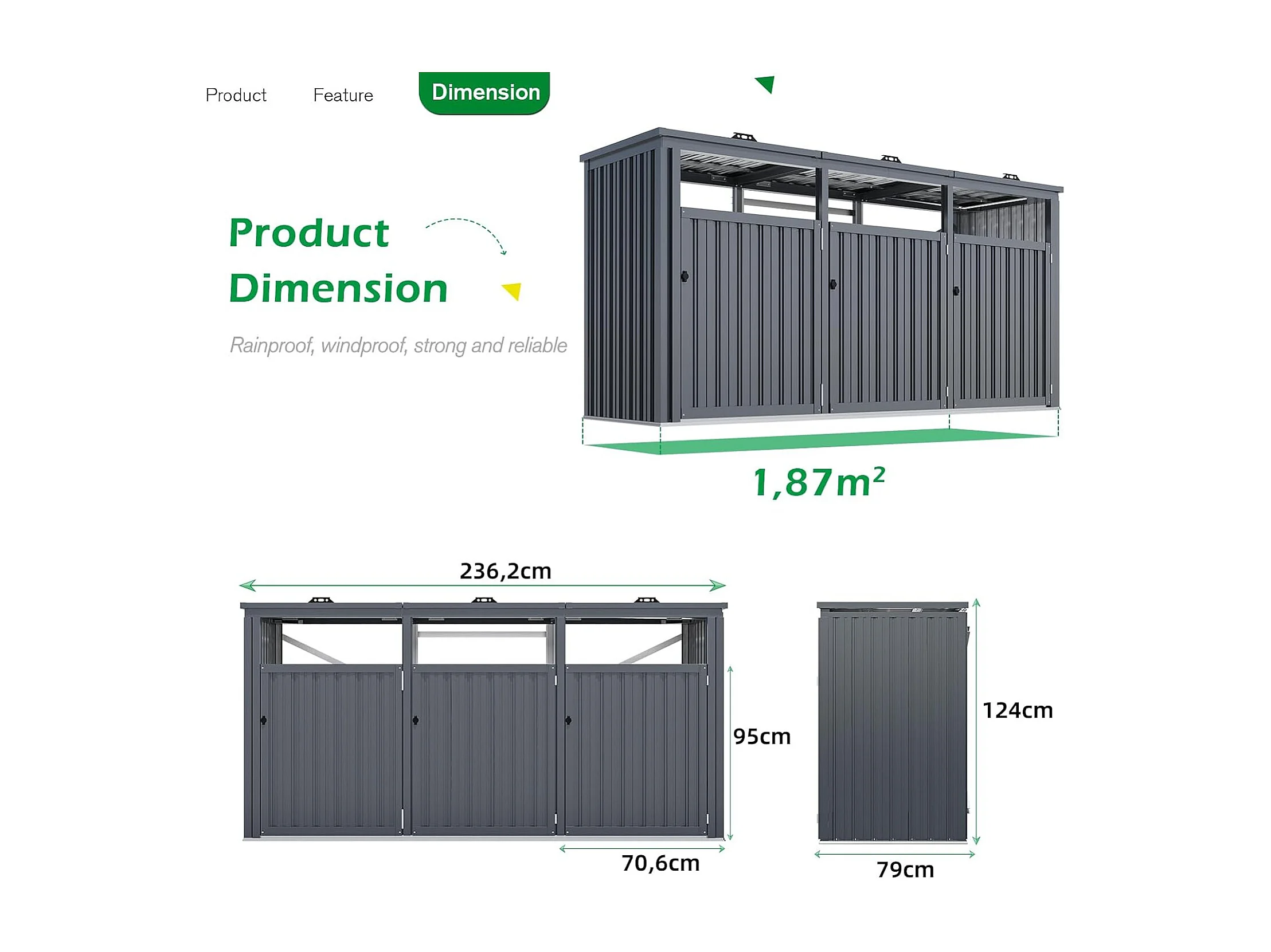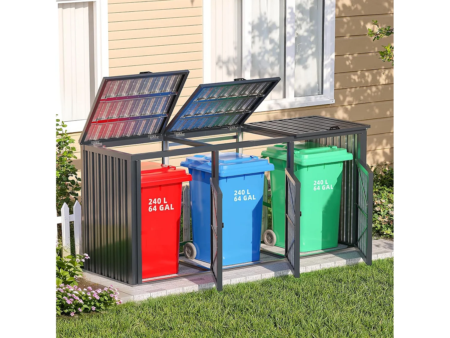 YODOLLA Mülltonnenbox für 3 Tonnen bis 240L, abschließbar und wetterfest für Außenbereich, 236x79x124cm, Dunkelgrau