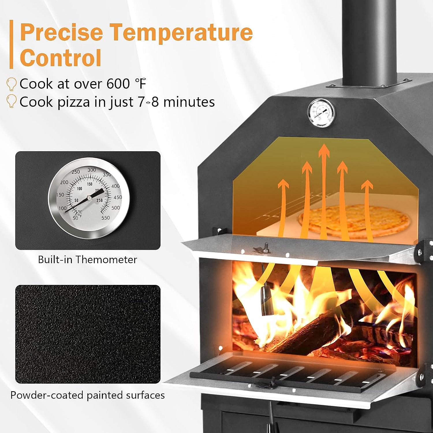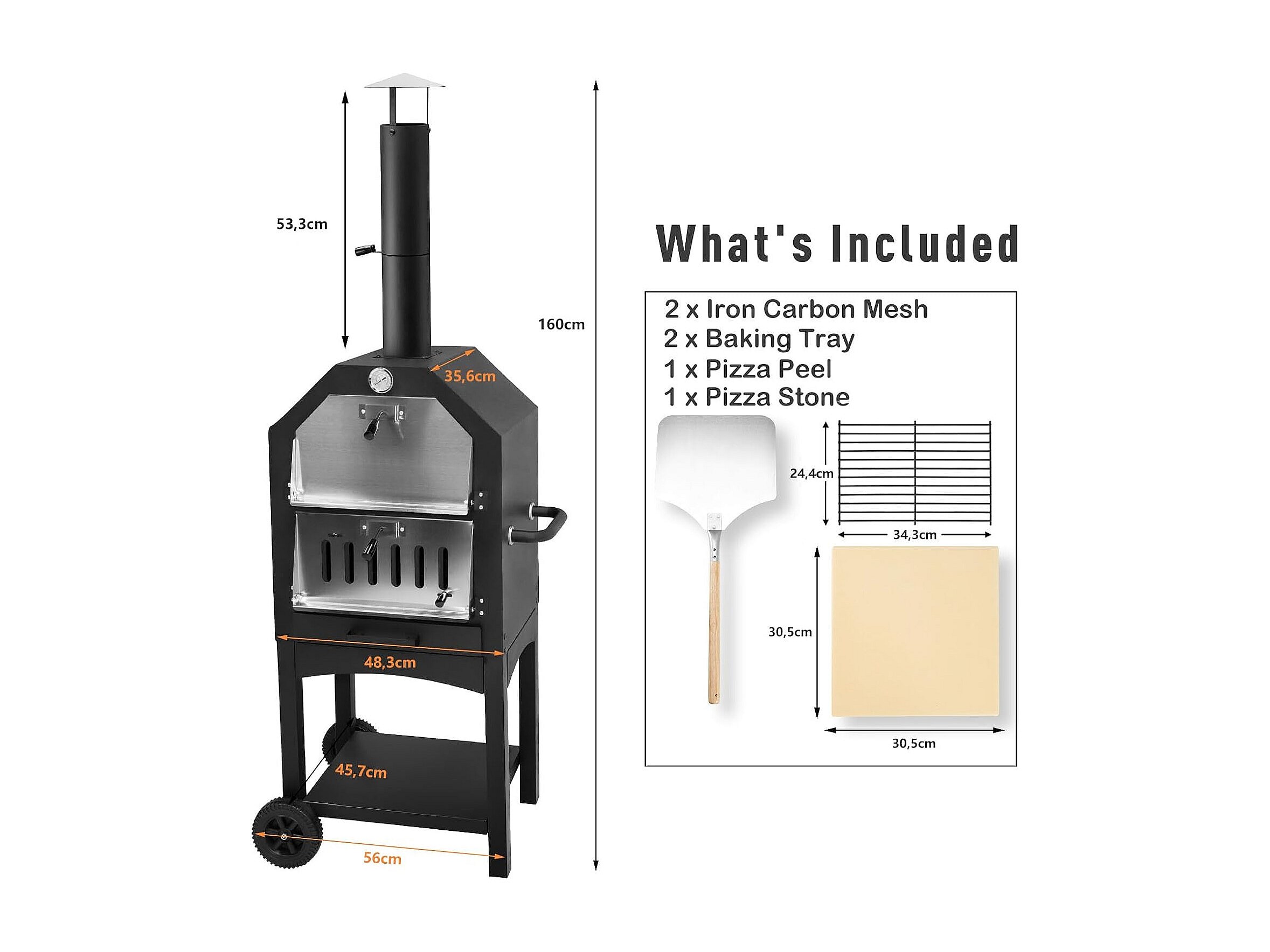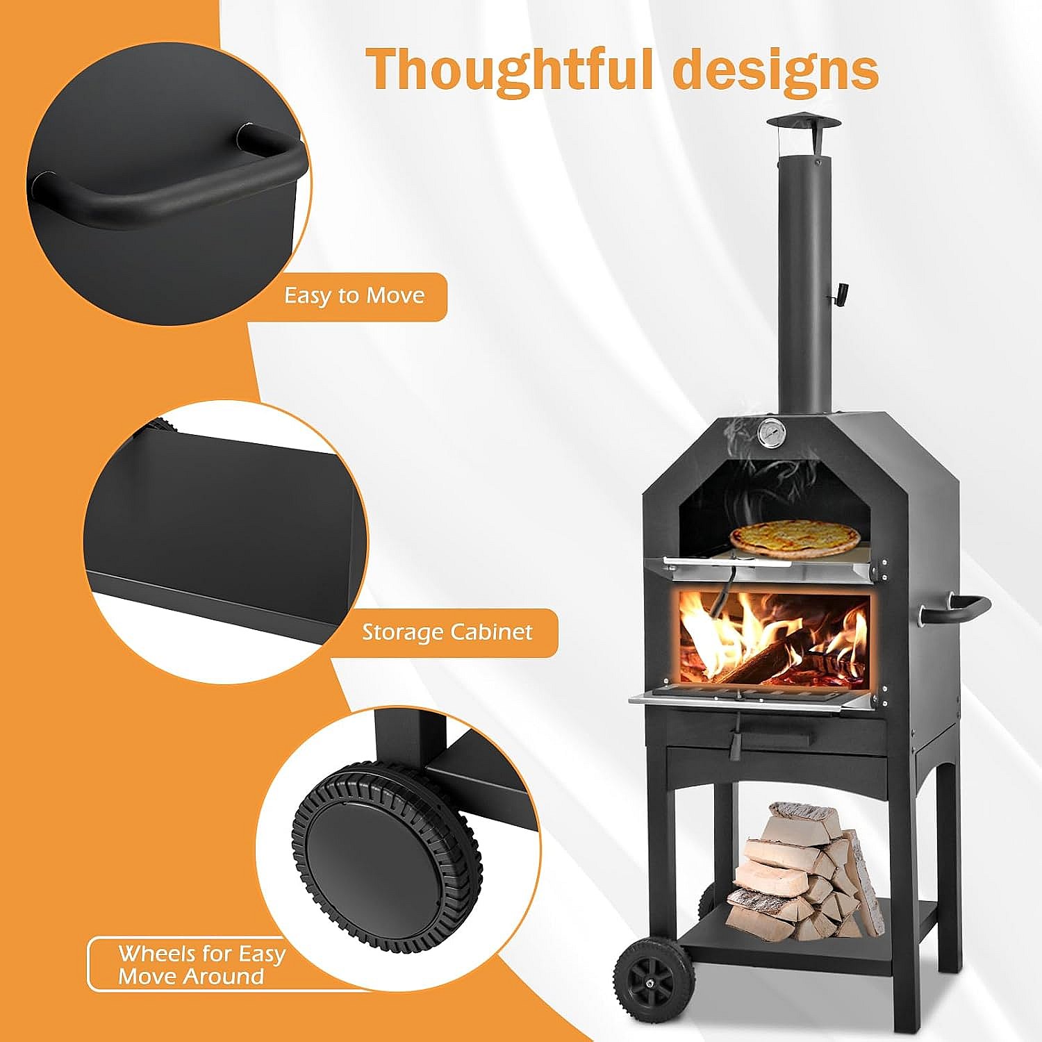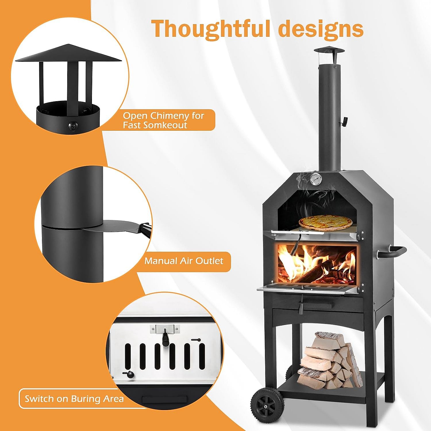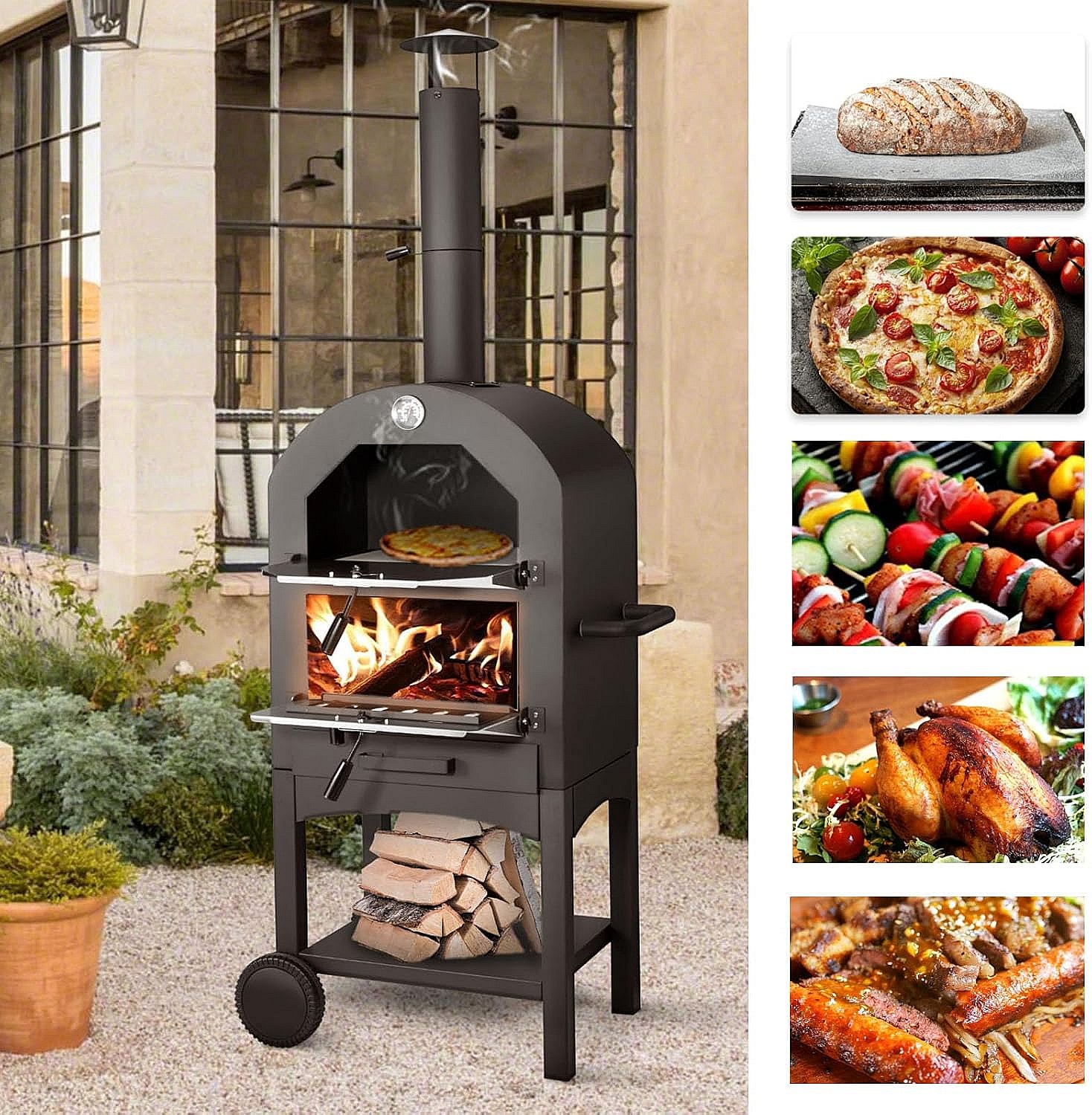 YODOLLA Outdoor Pizzaofen holzbefeuerter Pizzabäcker mit Pizzastein, Gartengrill mit Rädern für draußen Camping & Hinterhofparty