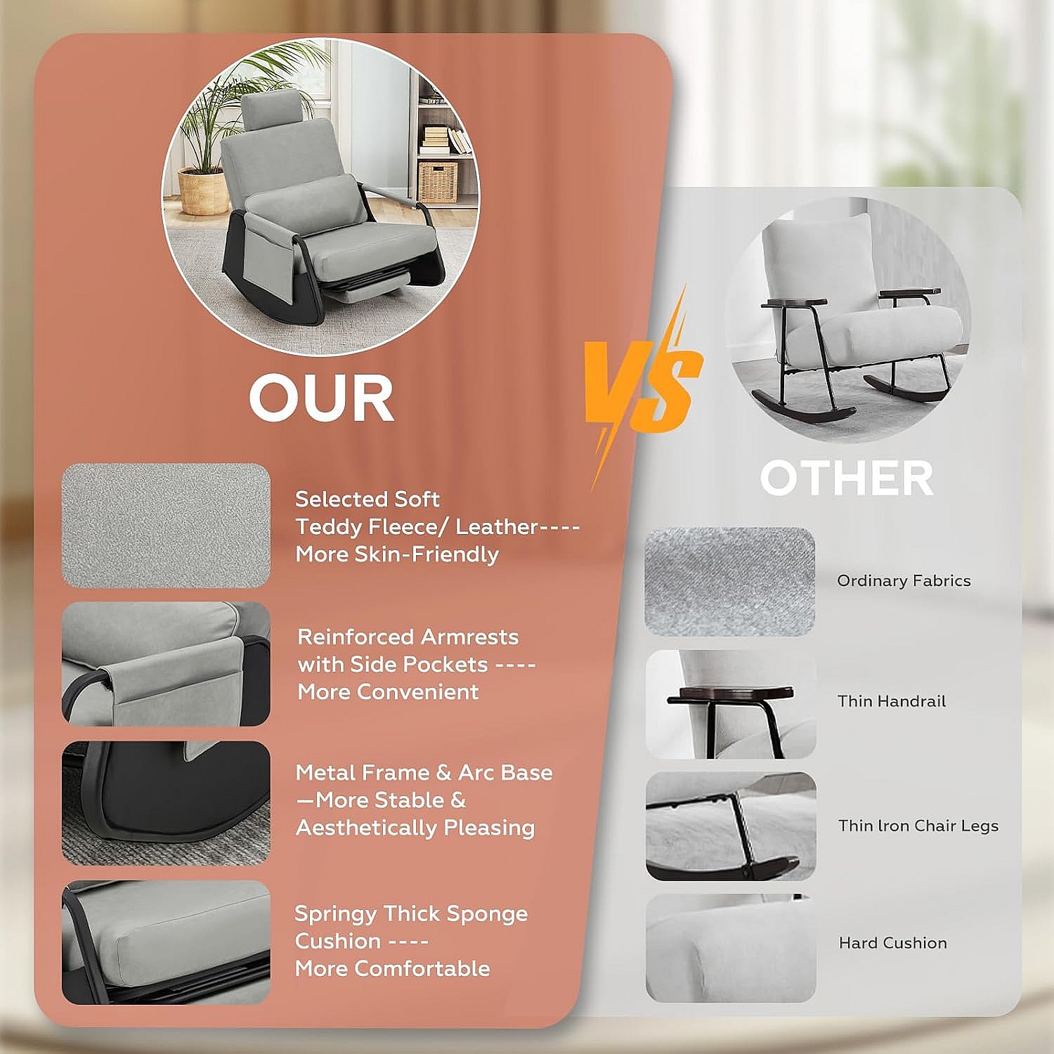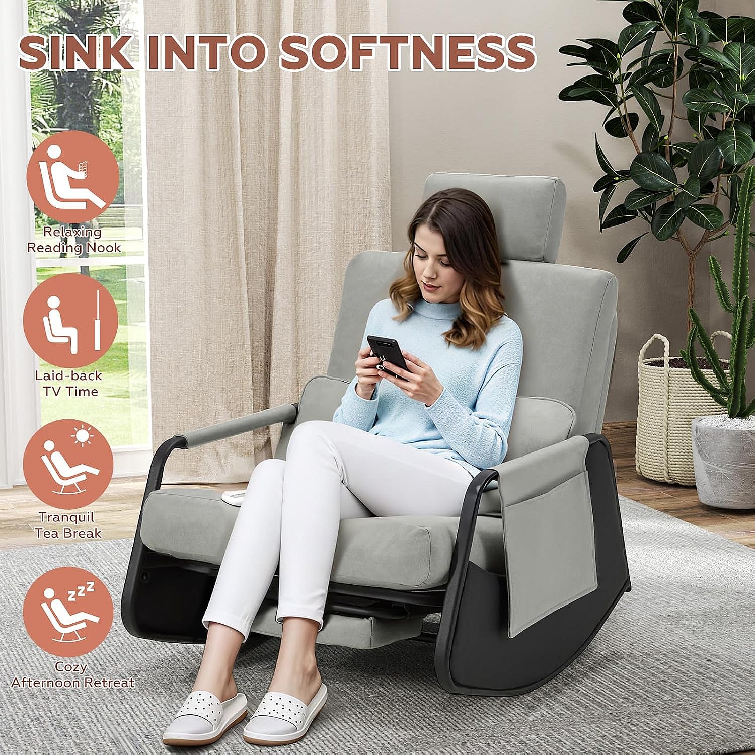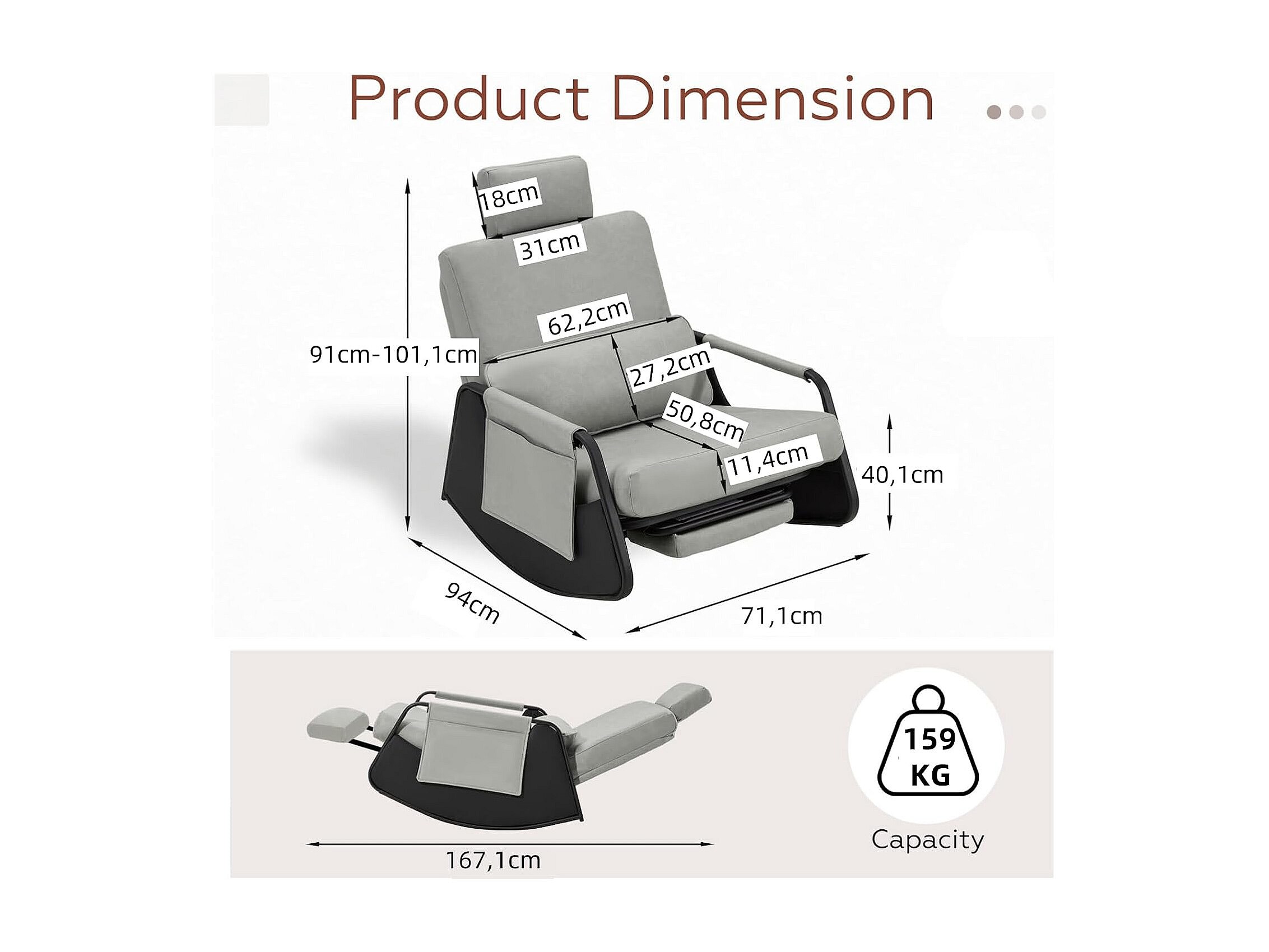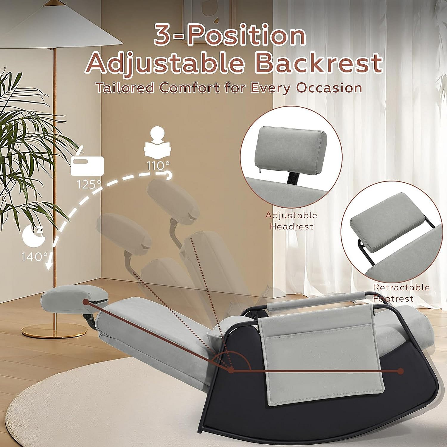 YODOLLA Schaukelstuhl mit 3-fach verstellbarer Rückenlehne, einziehbarer Fußstütze, Kopfstütze & Seitentasche, Graues Leder