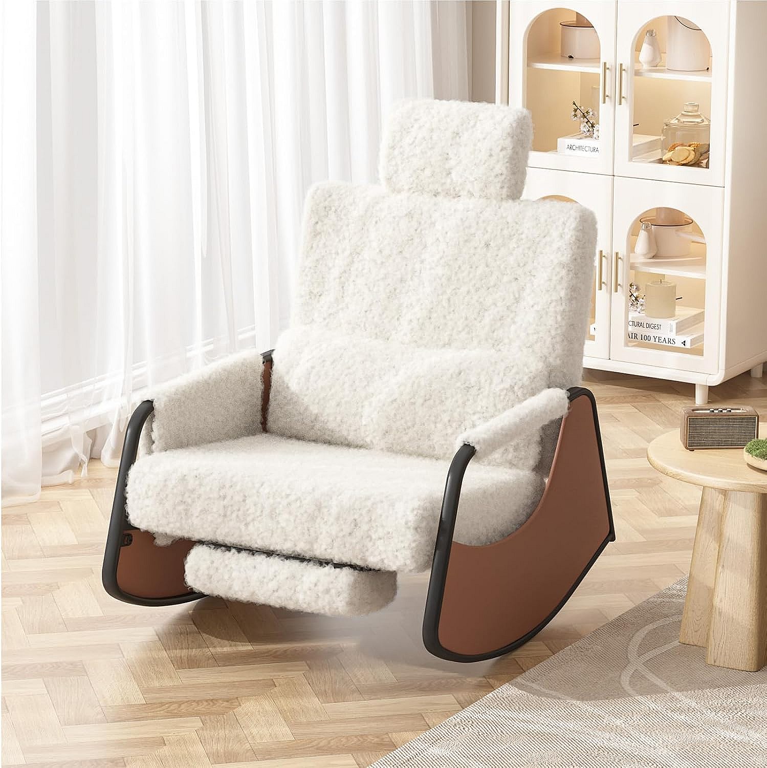YODOLLA Schaukelstuhl mit 3-fach verstellbarer Rückenlehne, einziehbarer Fußstütze und Seitentasche, Stillstuhl mit Kopfstütze, Weißer Teddy-Samt