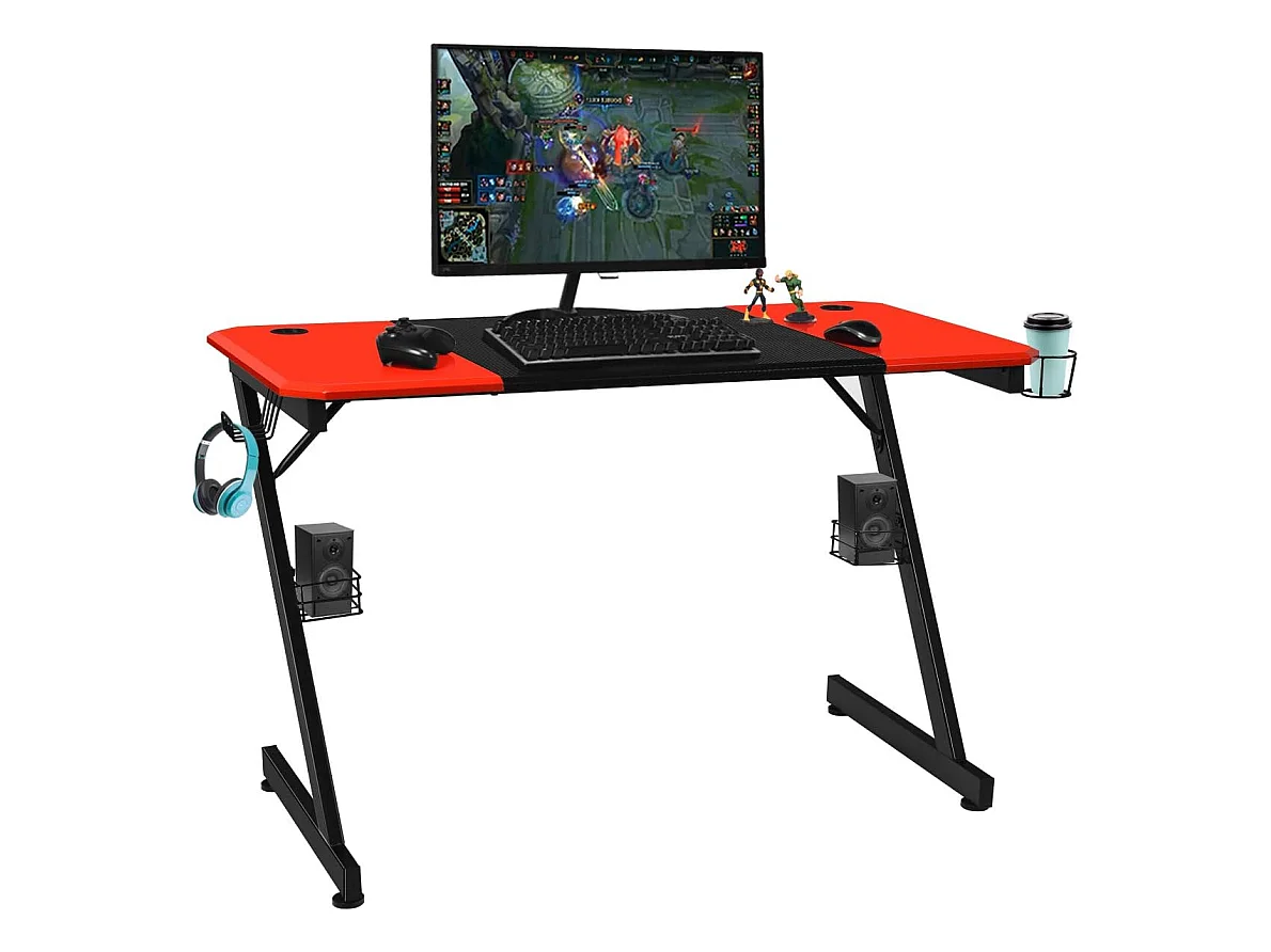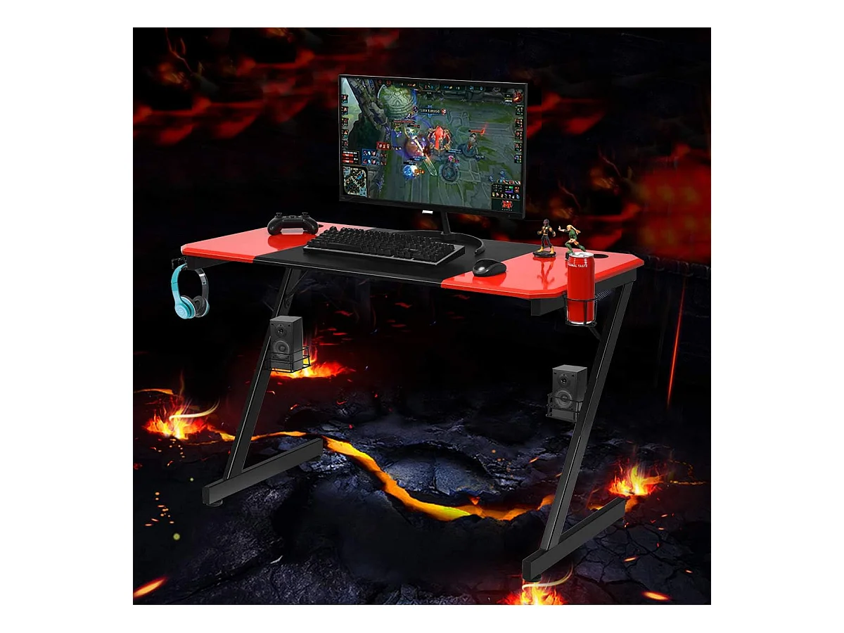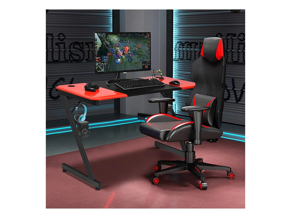 Z-förmiger Gaming Tisch Computertisch PC Tisch mit Becherhalter Kopfhörerhaken & Boxenständer Schreibtisch schwarz/rot