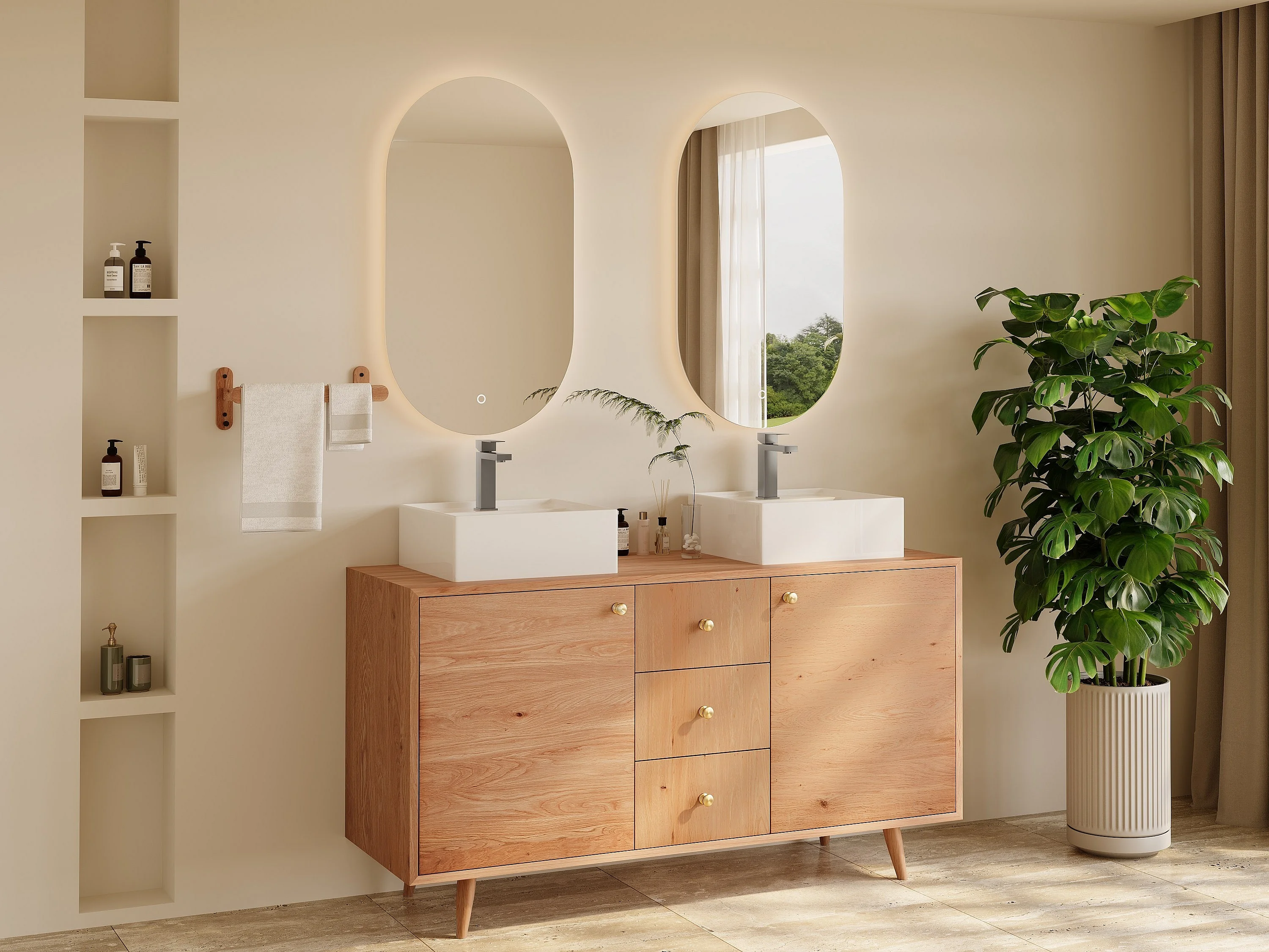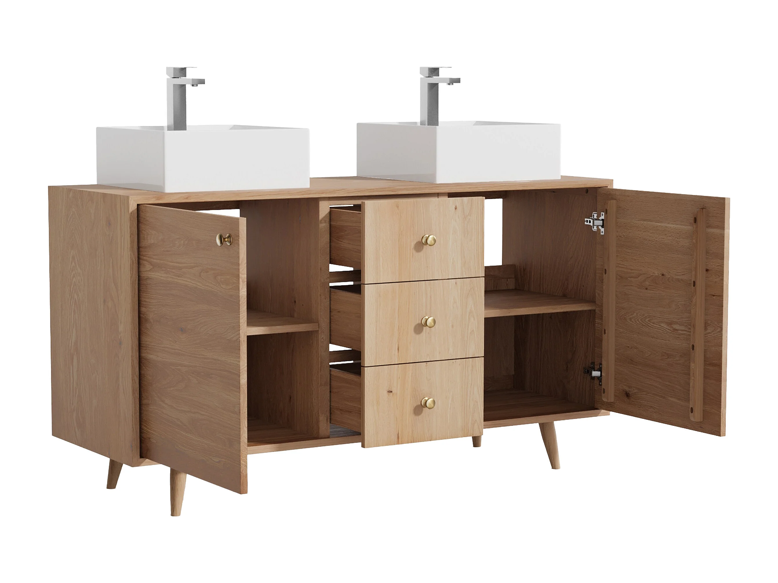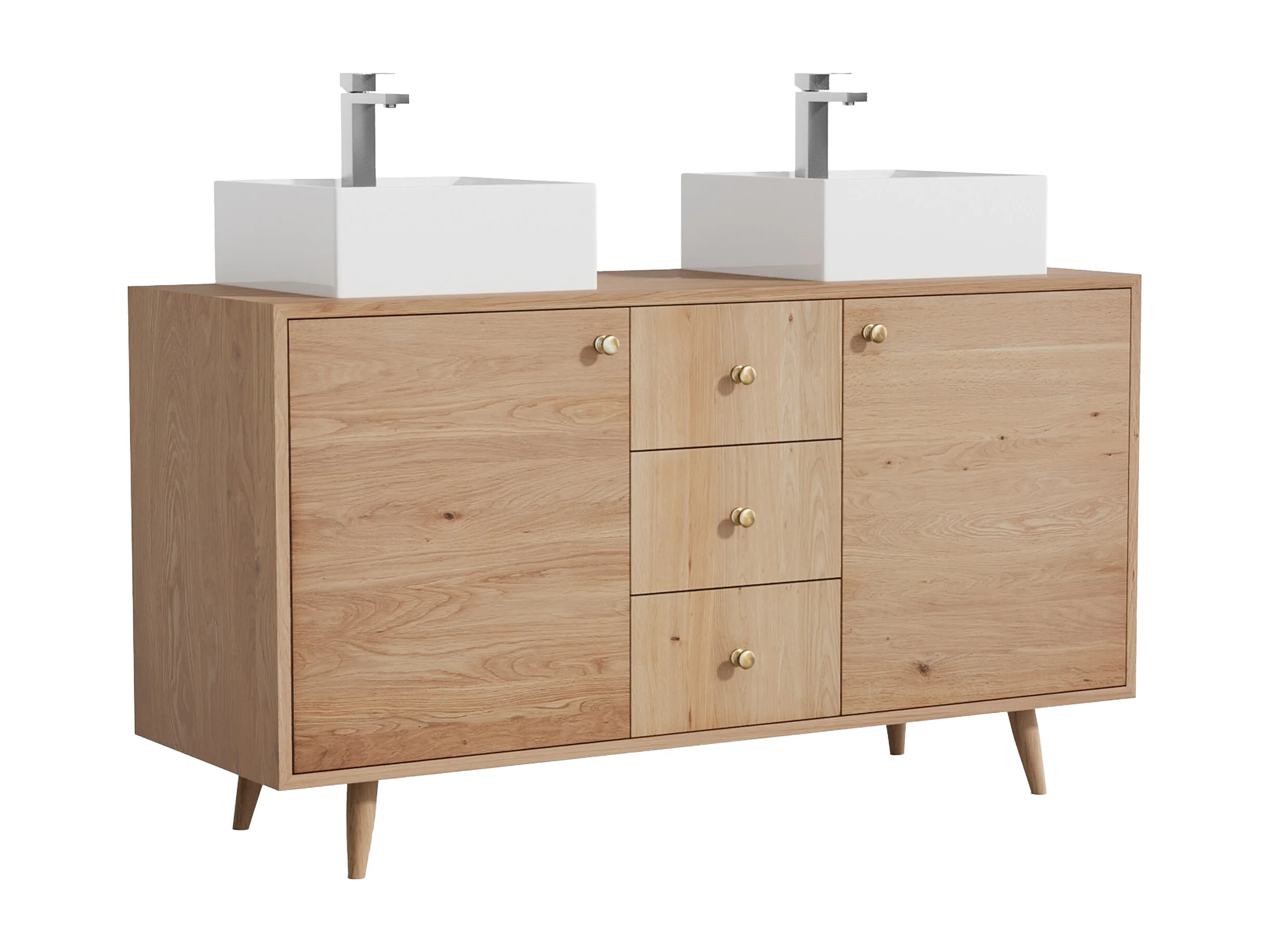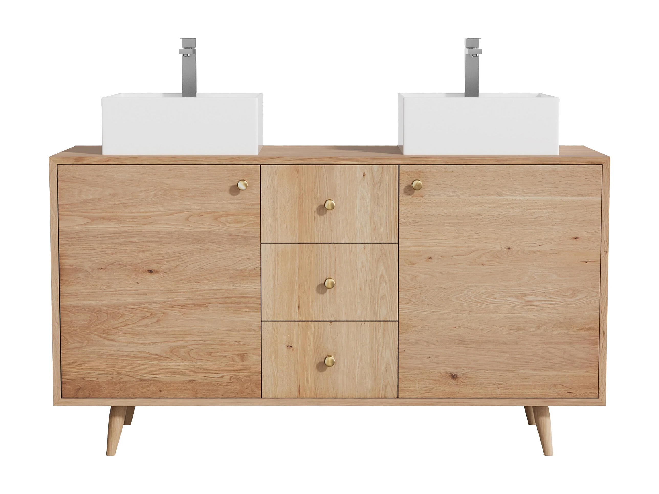 Unterschrank aus Massivholz Eiche mit quadratischem Aufsatzbecken und Armatur - Hell Natur - 145 cm - ZARENO