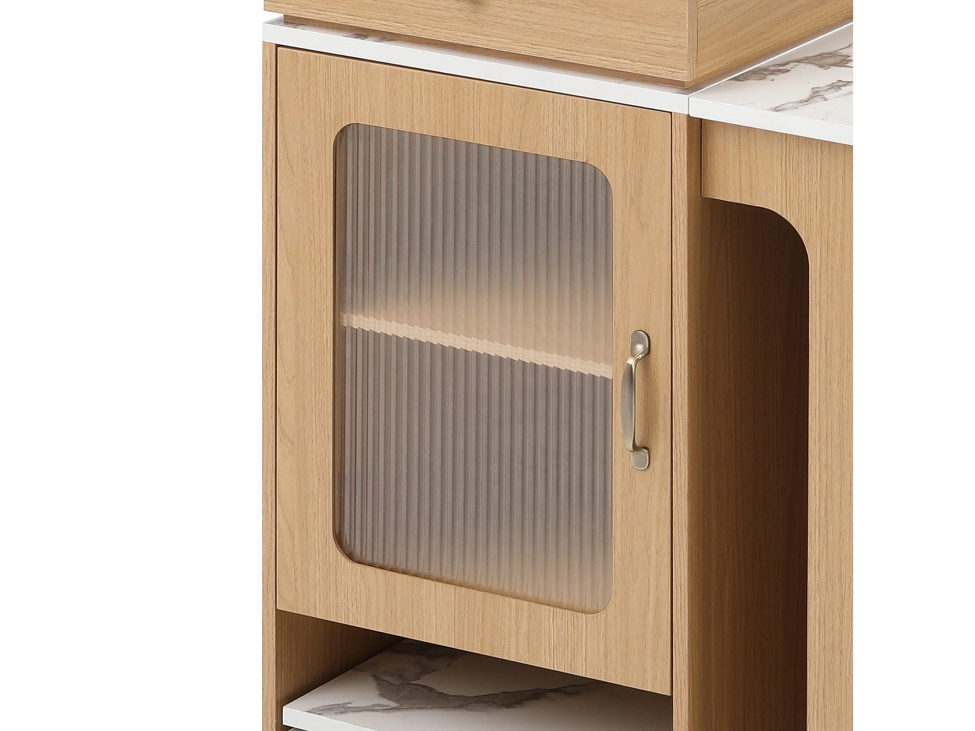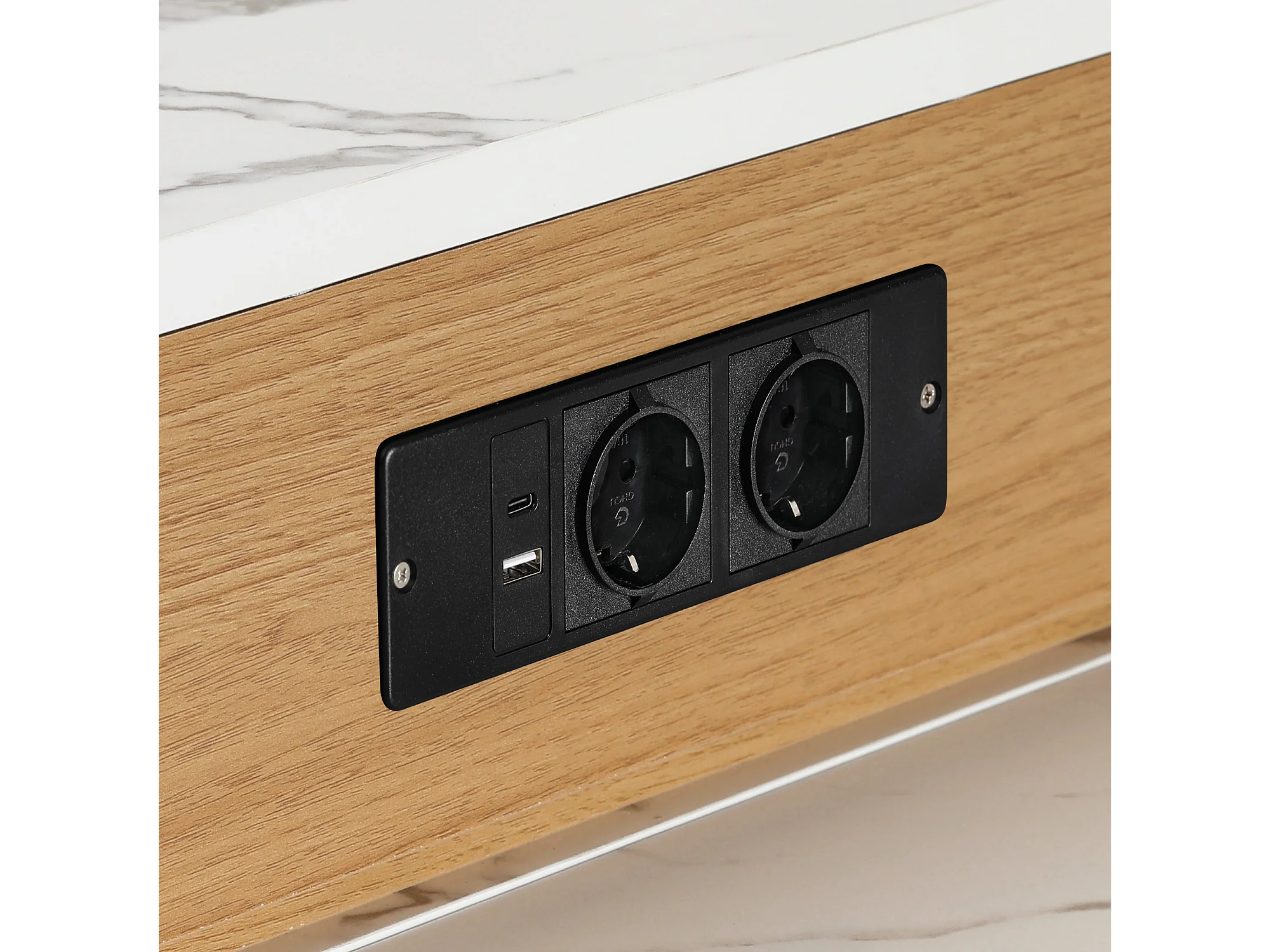 Zentrale Kücheninsel - mit Steckdose - mit abnehmbarem und ausziehbaren Esstisch - Holzmaserung und Marmorstruktur - natur + weiß