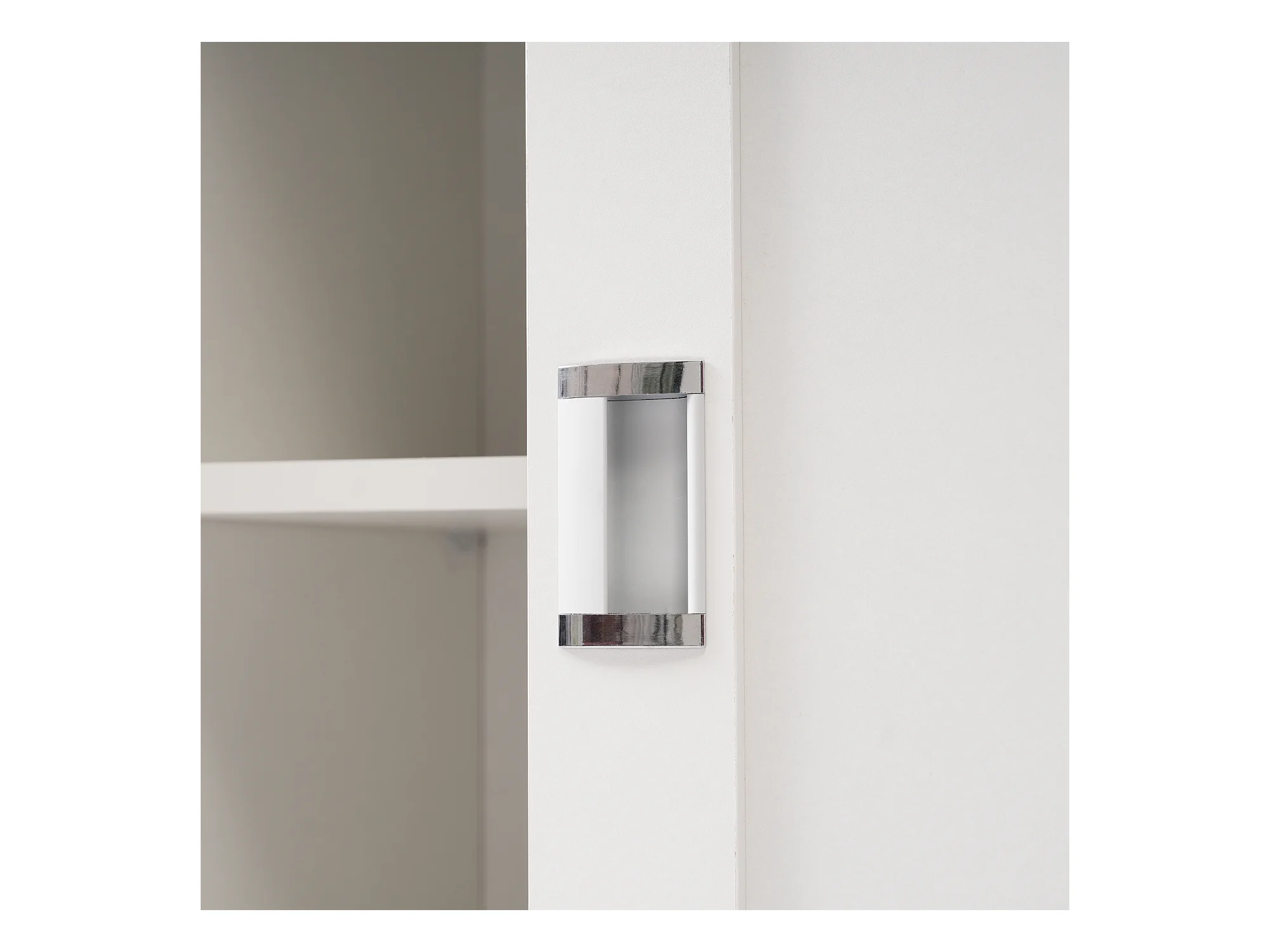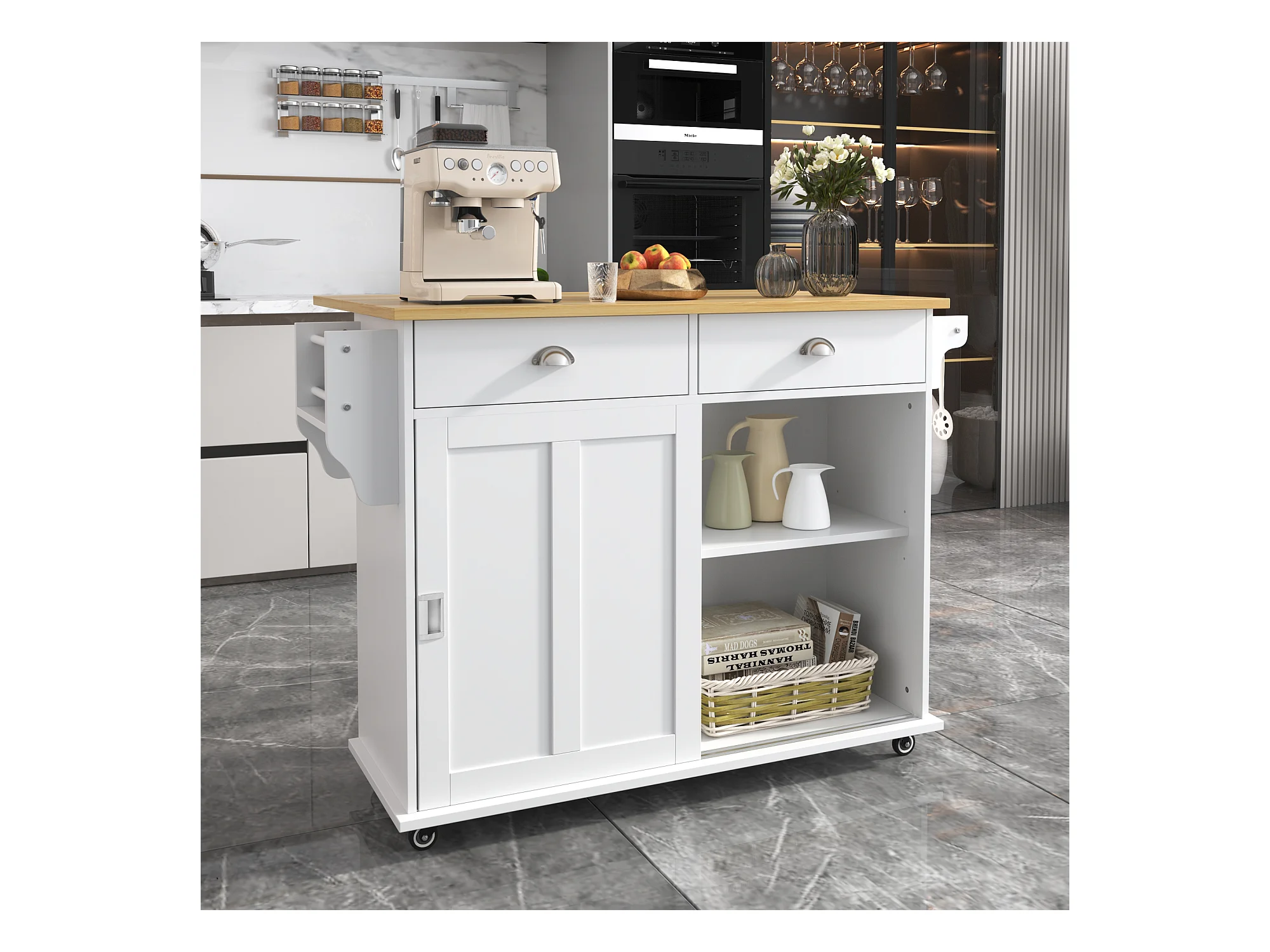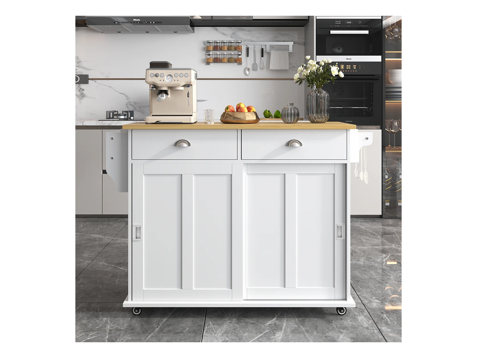 Zentrale mobile Kücheninsel mit 2 Schiebetüren – ausziehbare Platte – 112 x 40 (70) x 94 cm – MDF-Holz + Metall – Weiß und Holz