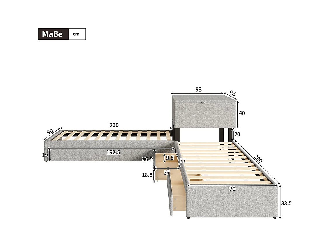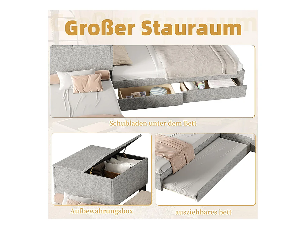 Zwei Einzelbetten 90x200 cm, mit Klappbett, Stauraum, Schrank, Bettwäsche, grau