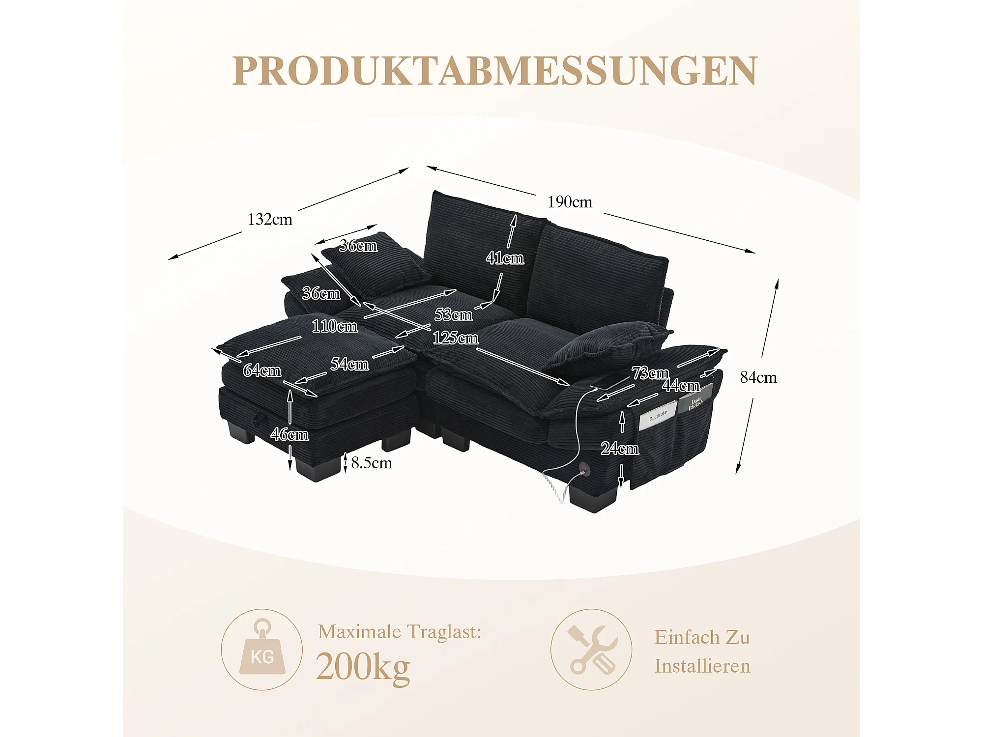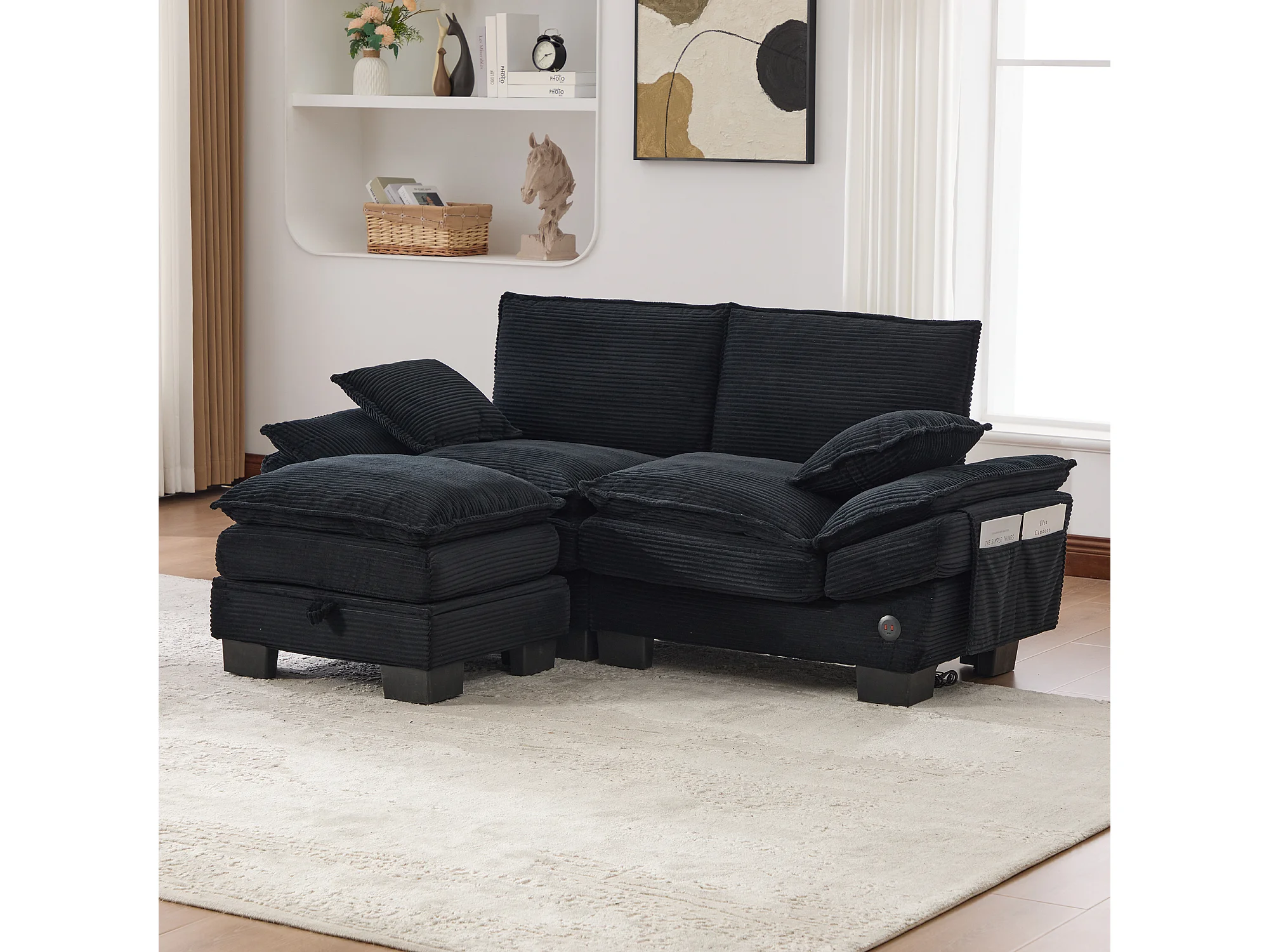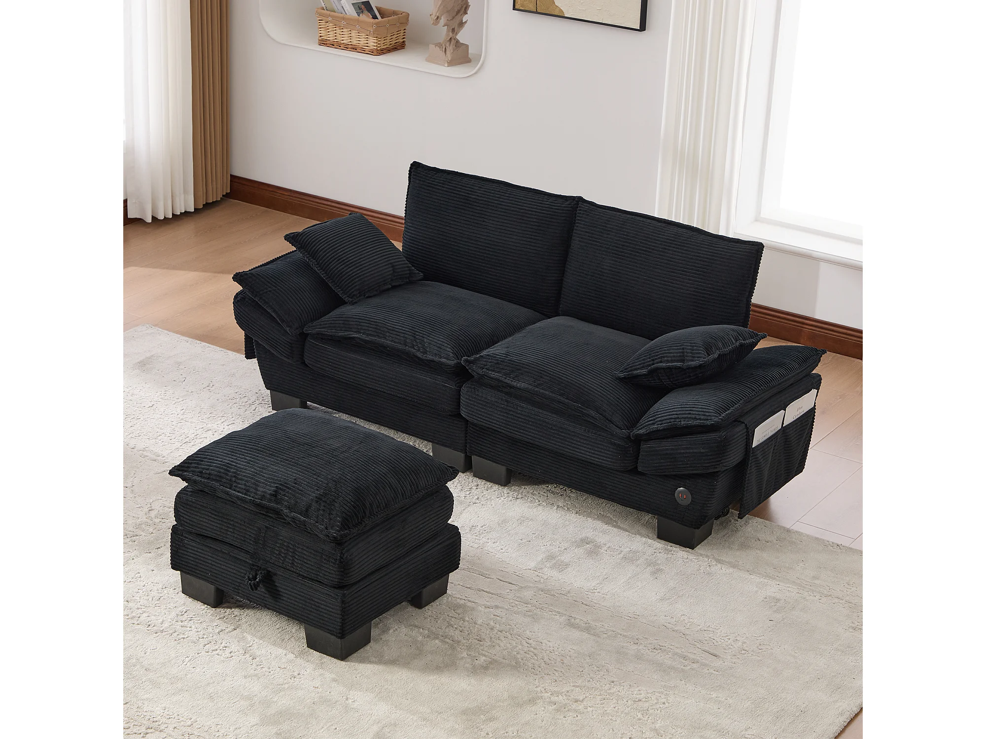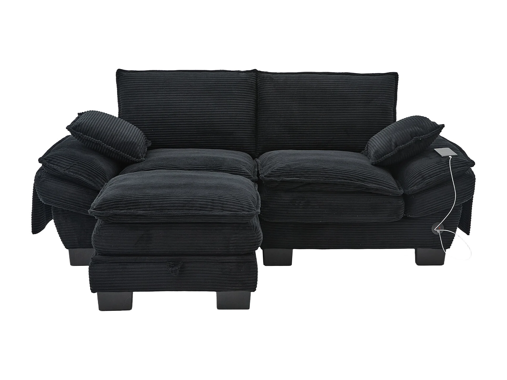 Zweisitzer-Cordsofa-Set – 190 x 132 x 84 cm – mit 1 Aufbewahrungshocker + USB-Anschluss + Taschen – schwarz
