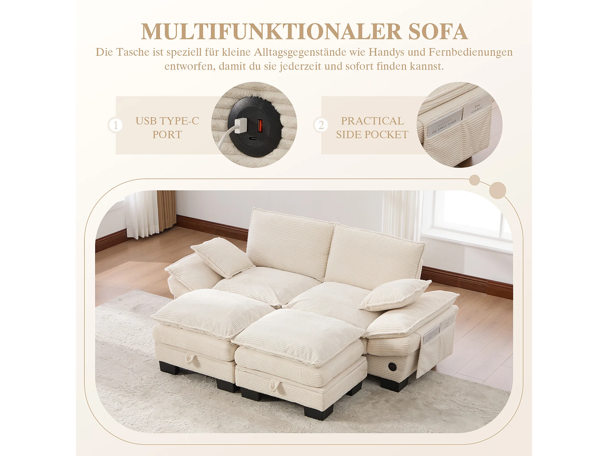 Zweisitzer-Cordsofa-Set – 190 x 132 x 84 cm – mit 2 Aufbewahrungshockern, USB-Anschluss und Taschen – beige