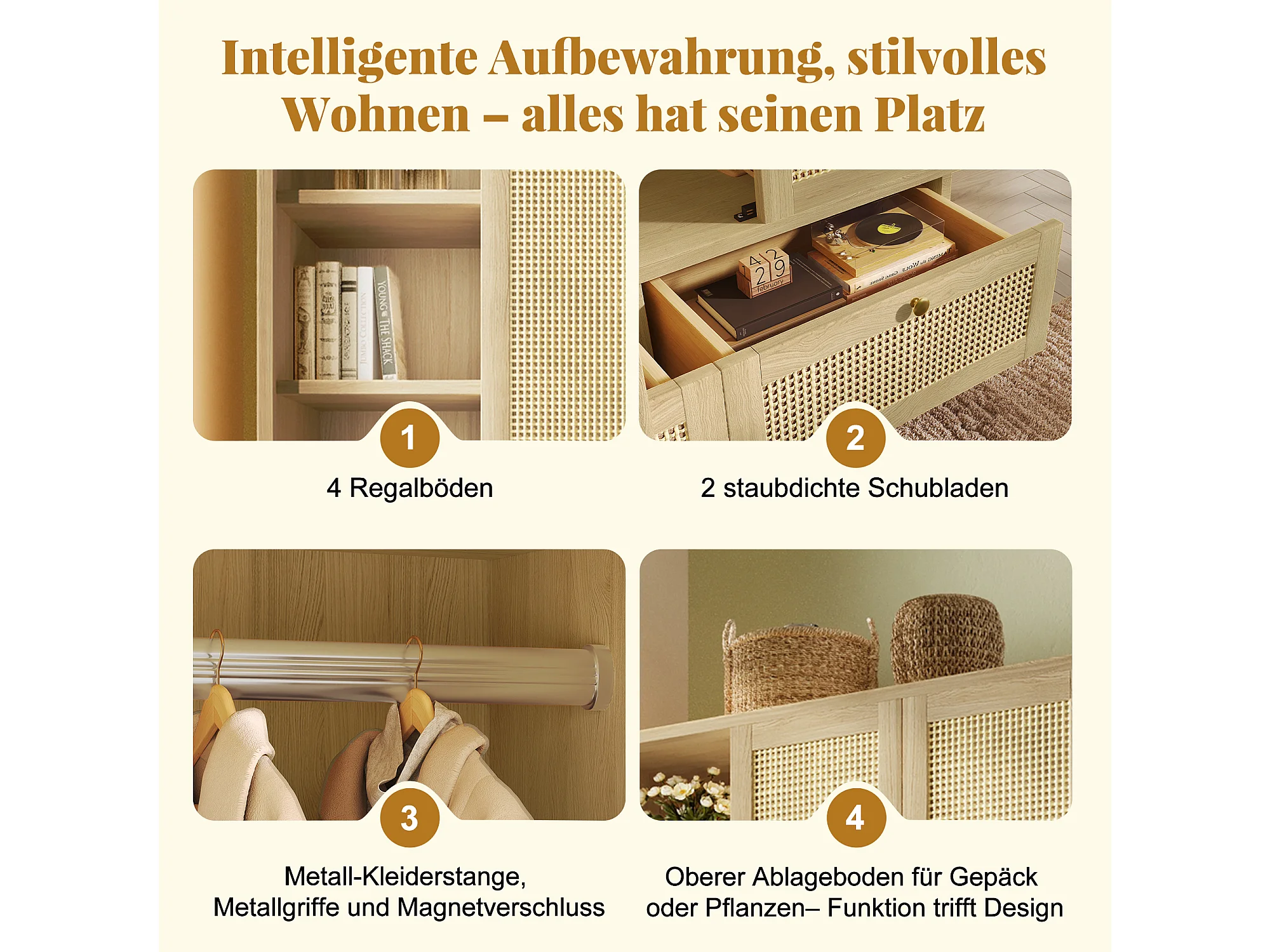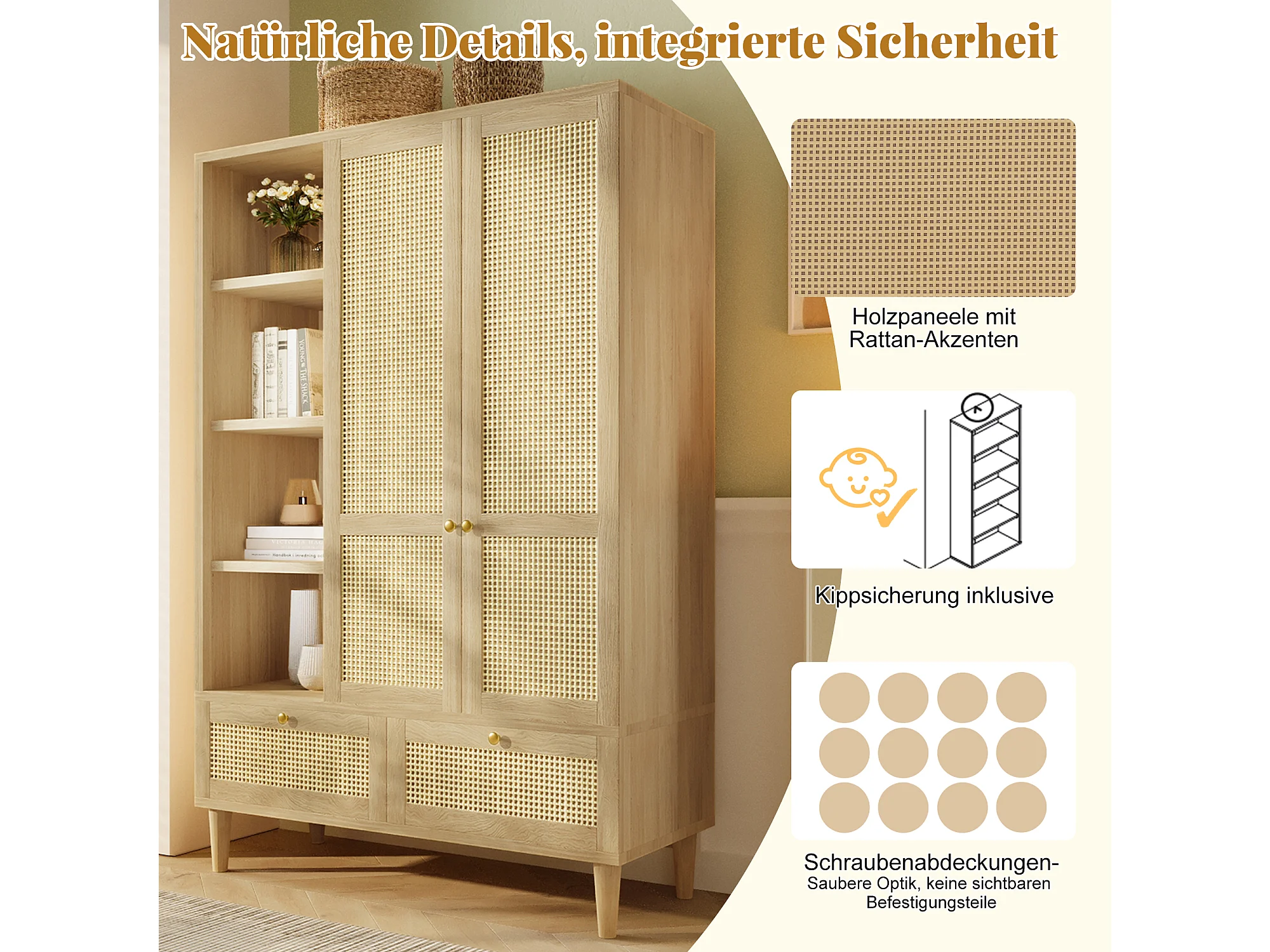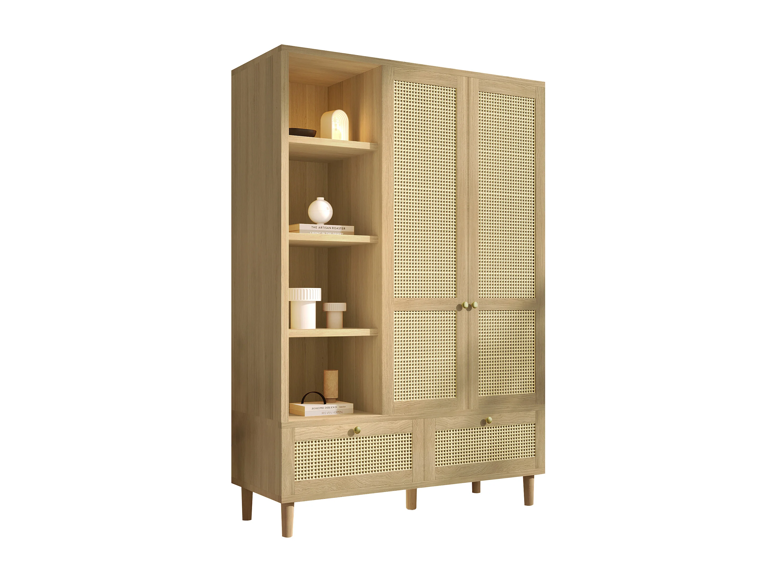 Zweitüriger Kleiderschrank aus Rattan – 120 x 50 x 180 cm – Landhausstil mit Eichenoptik – mit Einlegeböden und 2 Schubladen – Holz – natur