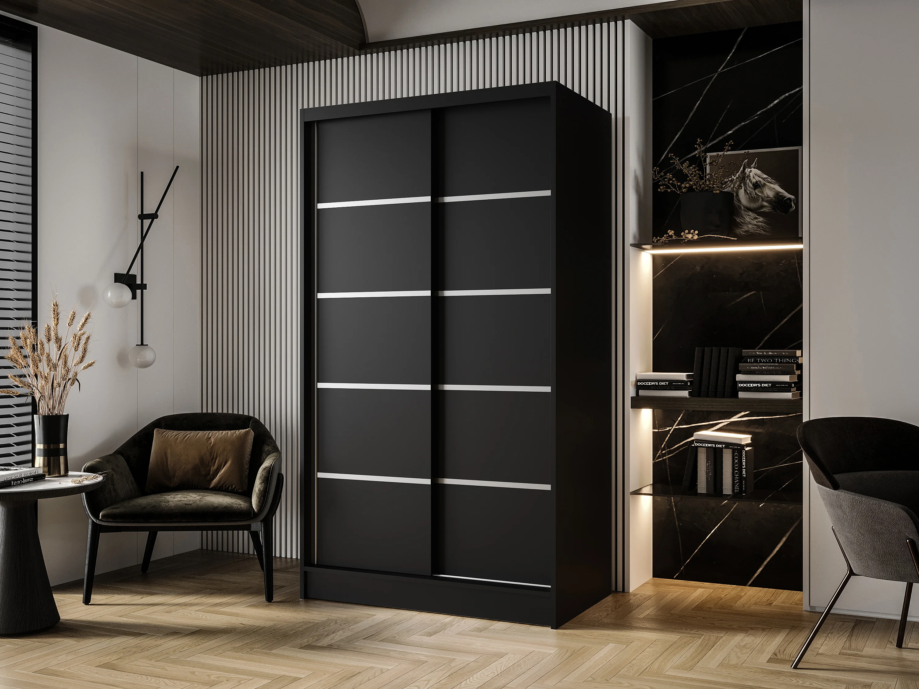 Zweitüriger Schiebeschrank DETROIT D4, Regalböden und Kleiderstange (Schwarz)