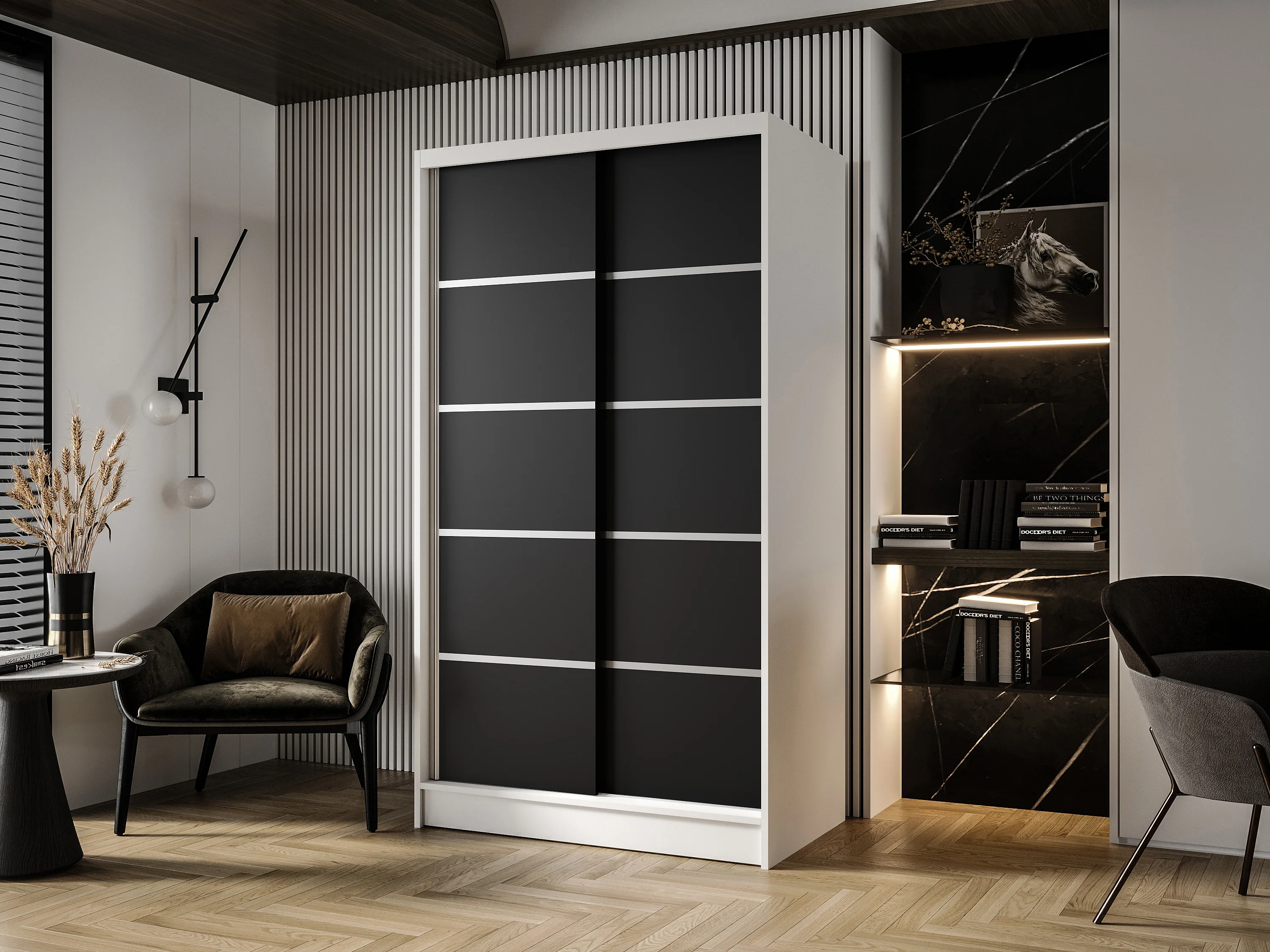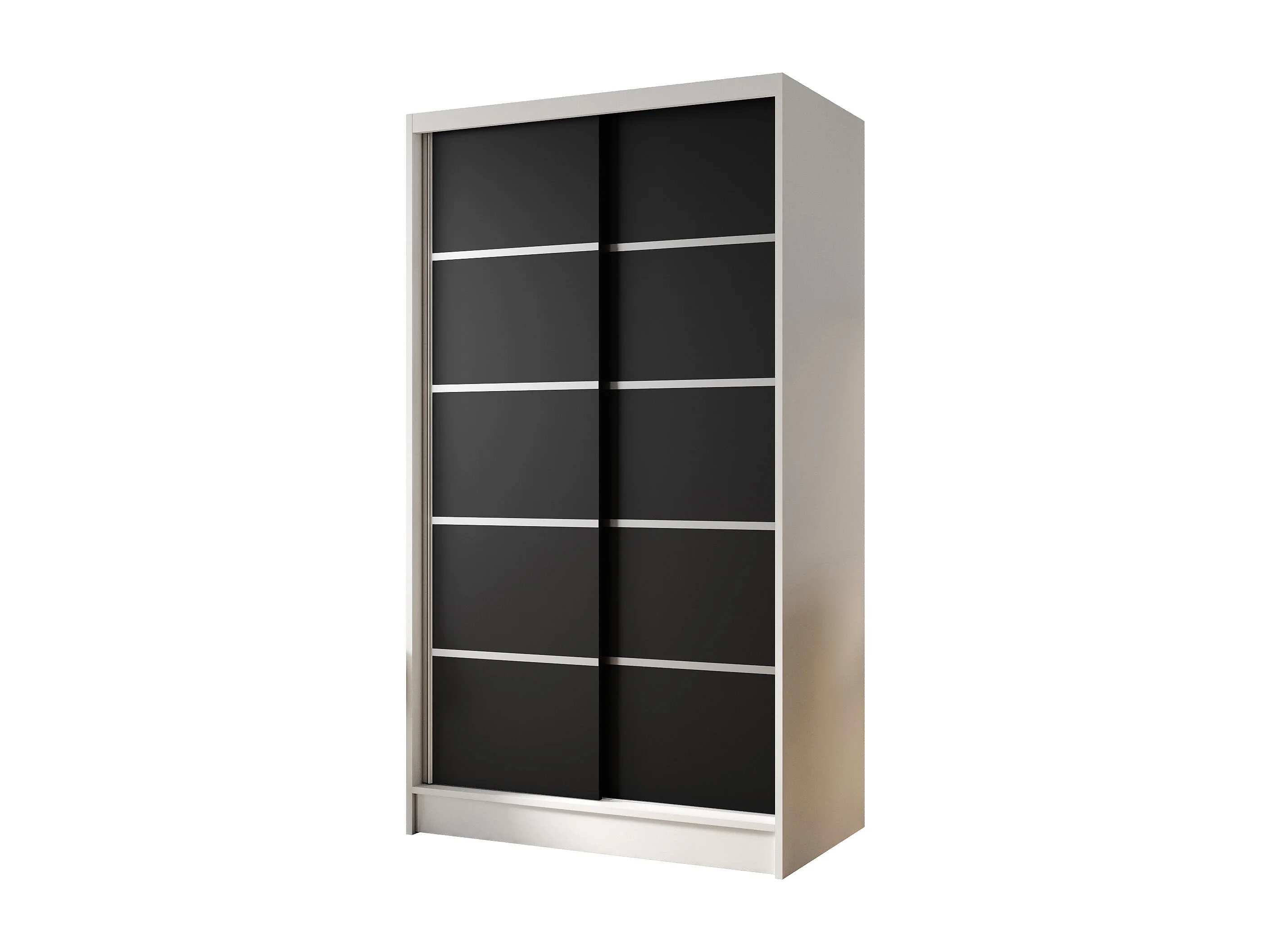Zweitüriger Schiebeschrank DETROIT D4, Regalböden und Kleiderstange (Weiß/Schwarz)