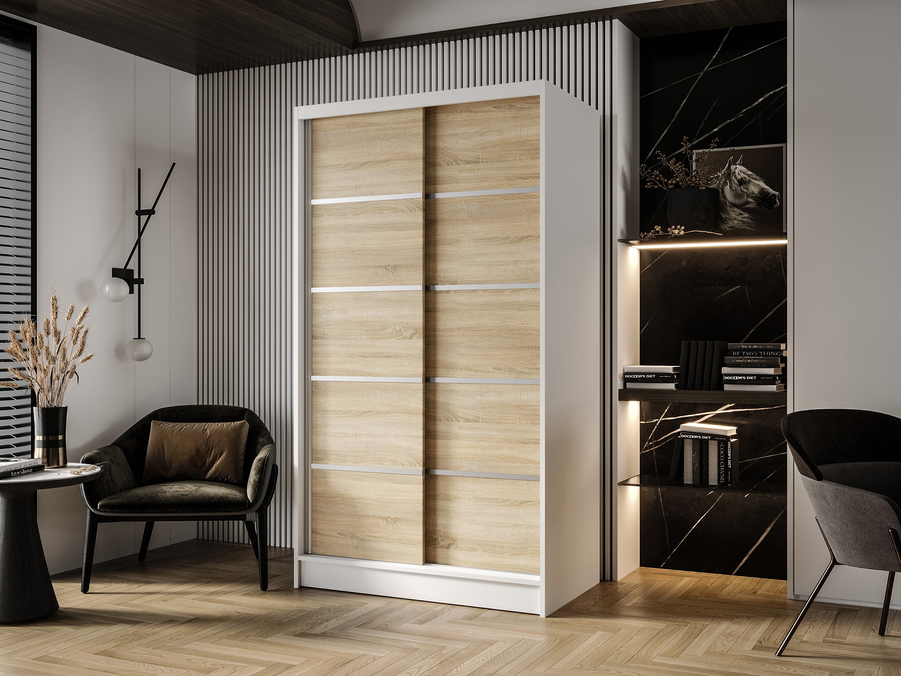 Zweitüriger Schiebeschrank DETROIT D4, Regalböden und Kleiderstange (Weiß/Sonoma)