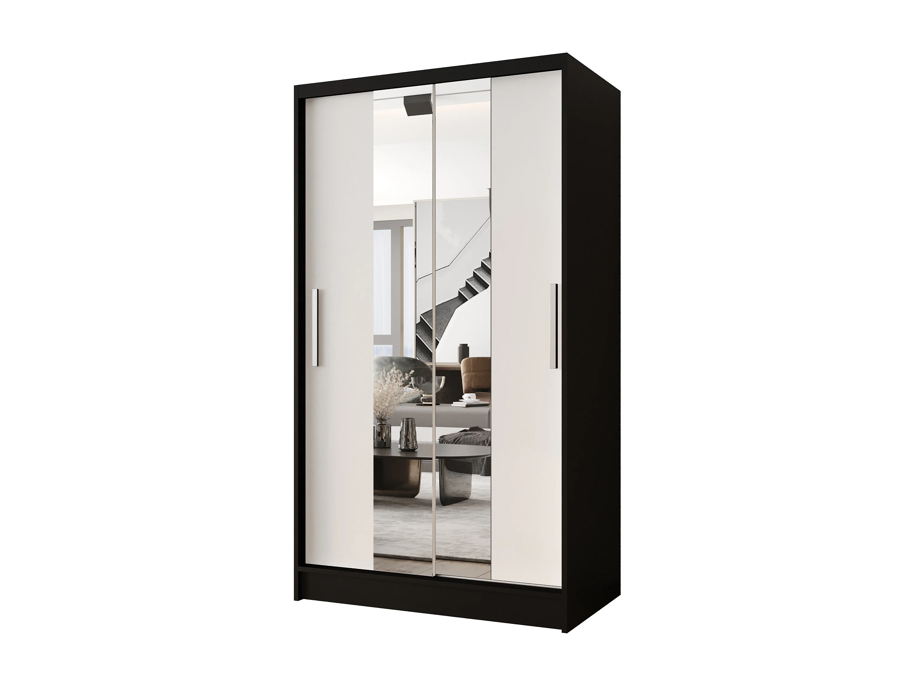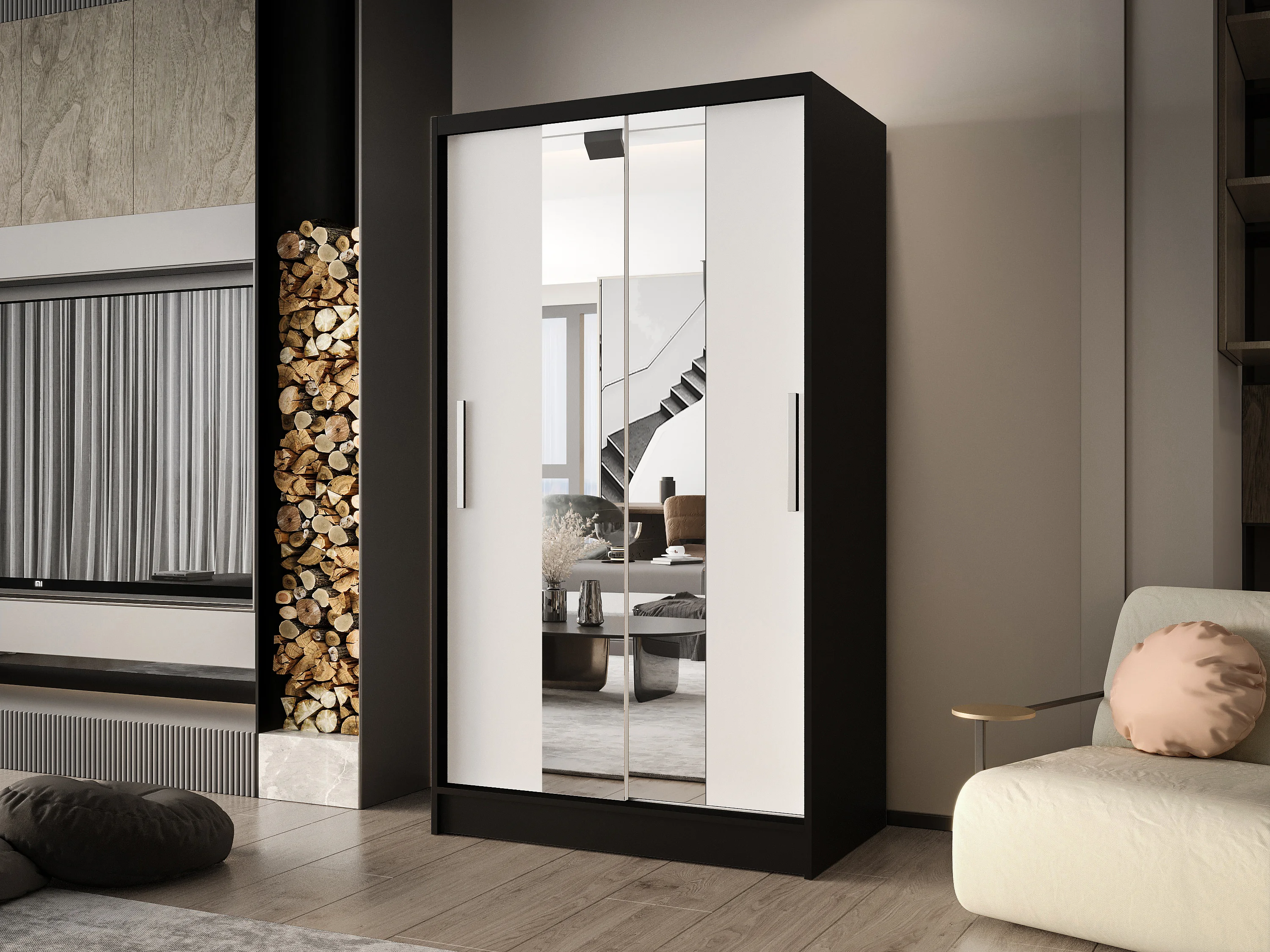 Zweitüriger Schiebeschrank mit Spiegel CHICAGO CA2, Regalböden und Kleiderstange (Schwarz/Weiß)