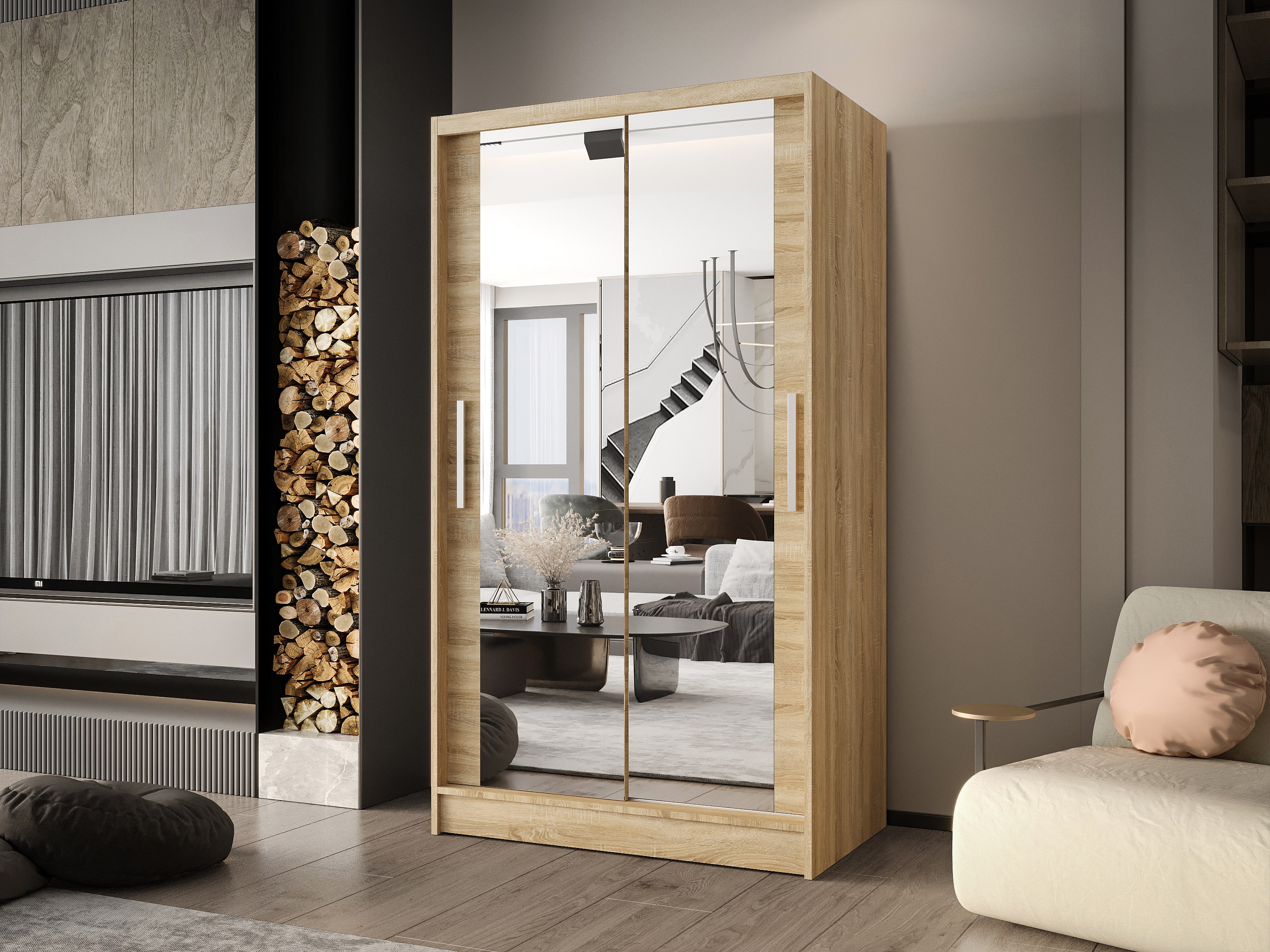 Zweitüriger Schiebeschrank mit Spiegel CHICAGO CA7, Regalböden und Kleiderstange (Sonoma)