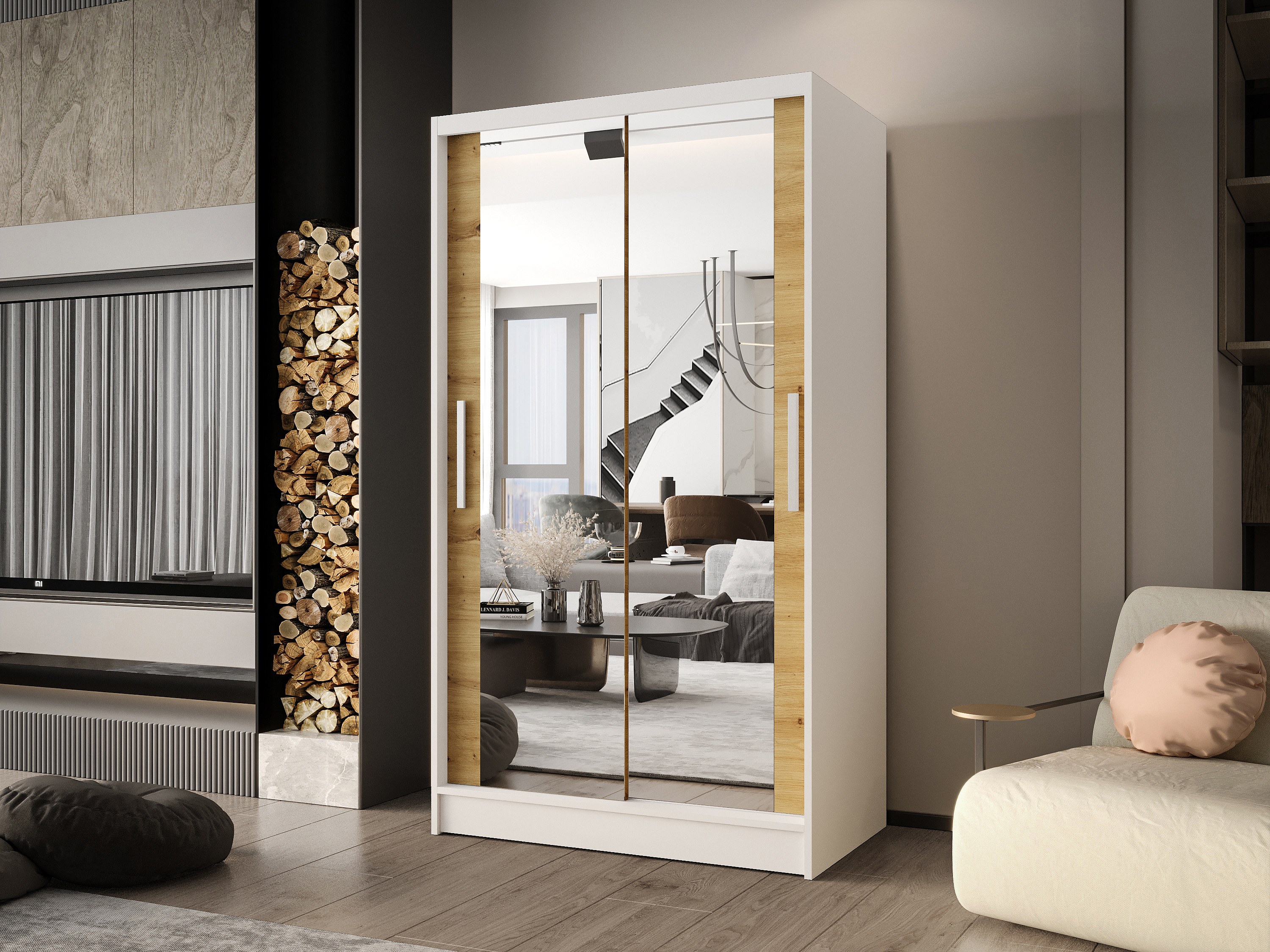 Zweitüriger Schiebeschrank mit Spiegel CHICAGO CA7, Regalböden und Kleiderstange (Weiß/Artisan)