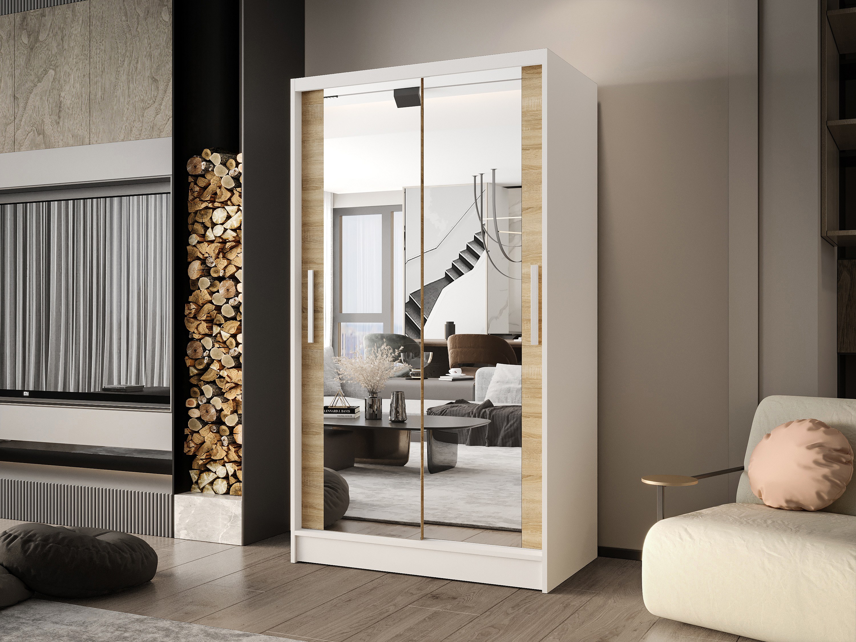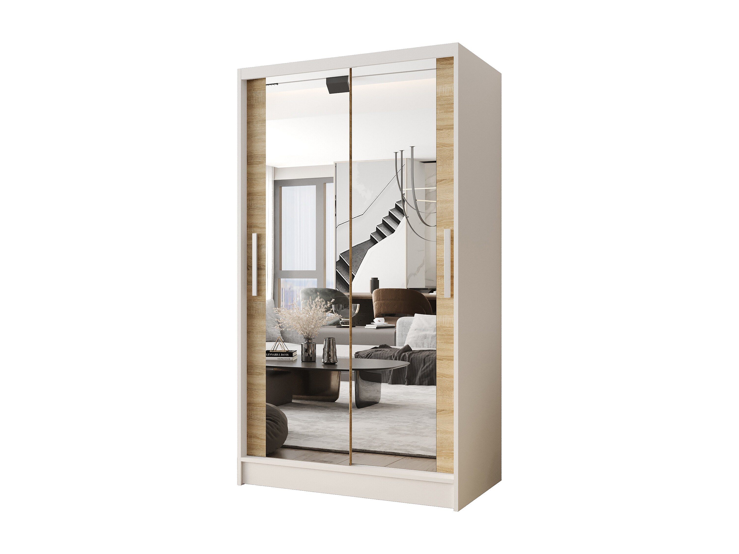 Zweitüriger Schiebeschrank mit Spiegel CHICAGO CA7, Regalböden und Kleiderstange (Weiß/Sonoma)