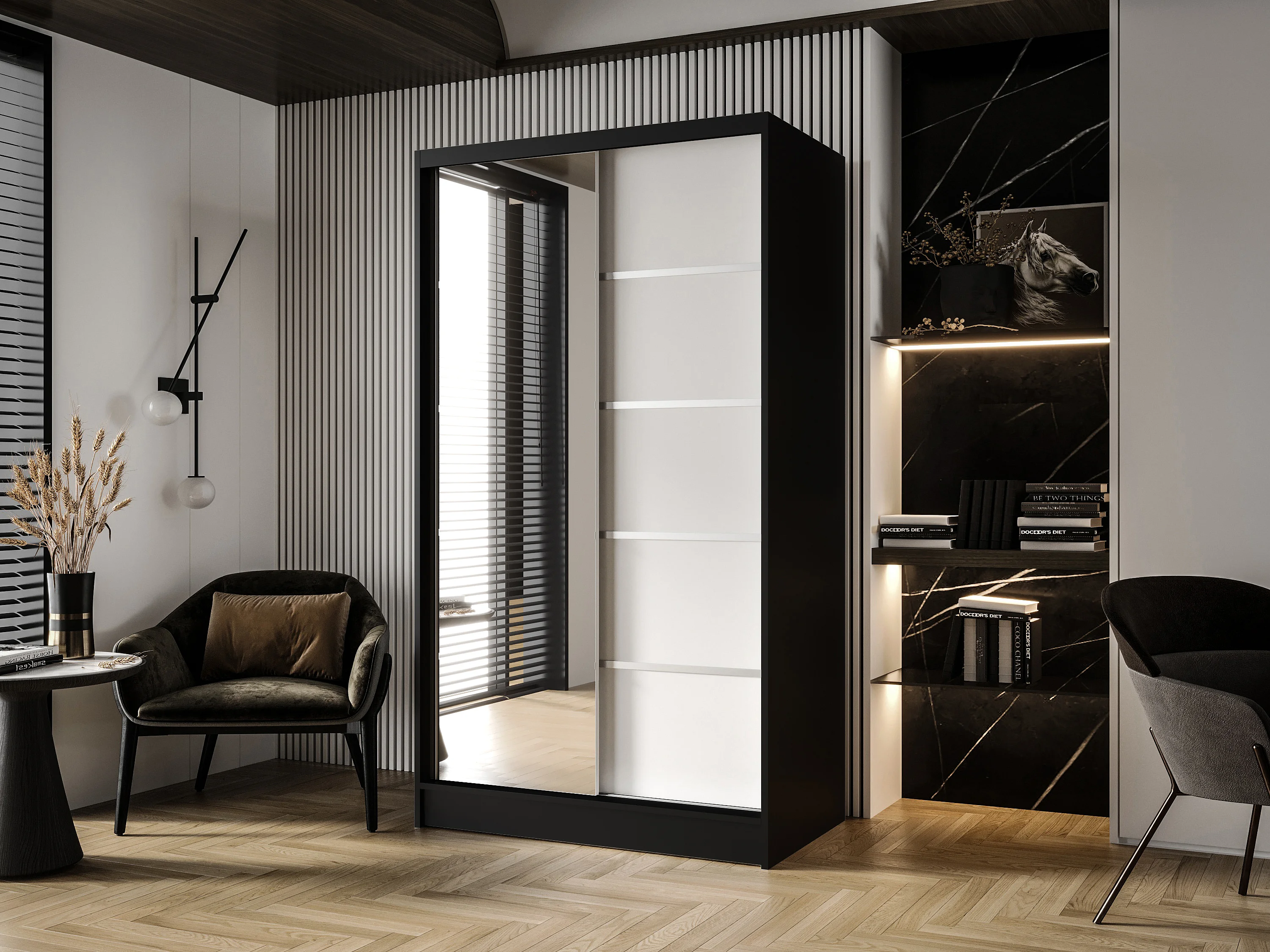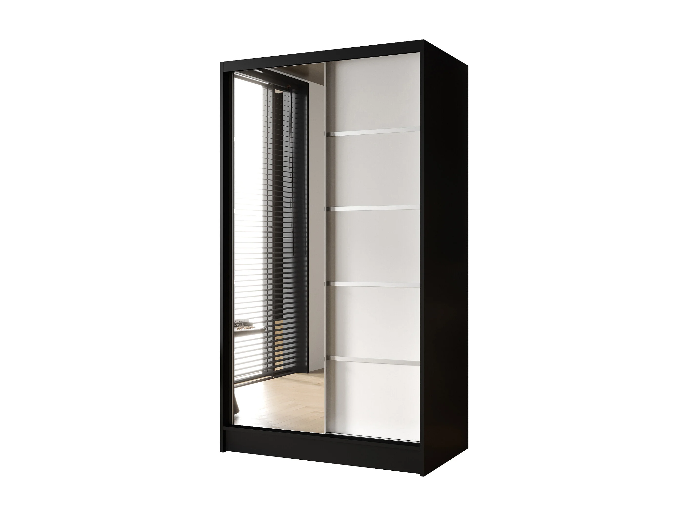 Zweitüriger Schiebeschrank mit Spiegel DETROIT D3, Regalböden und Kleiderstange (Schwarz/Weiß)