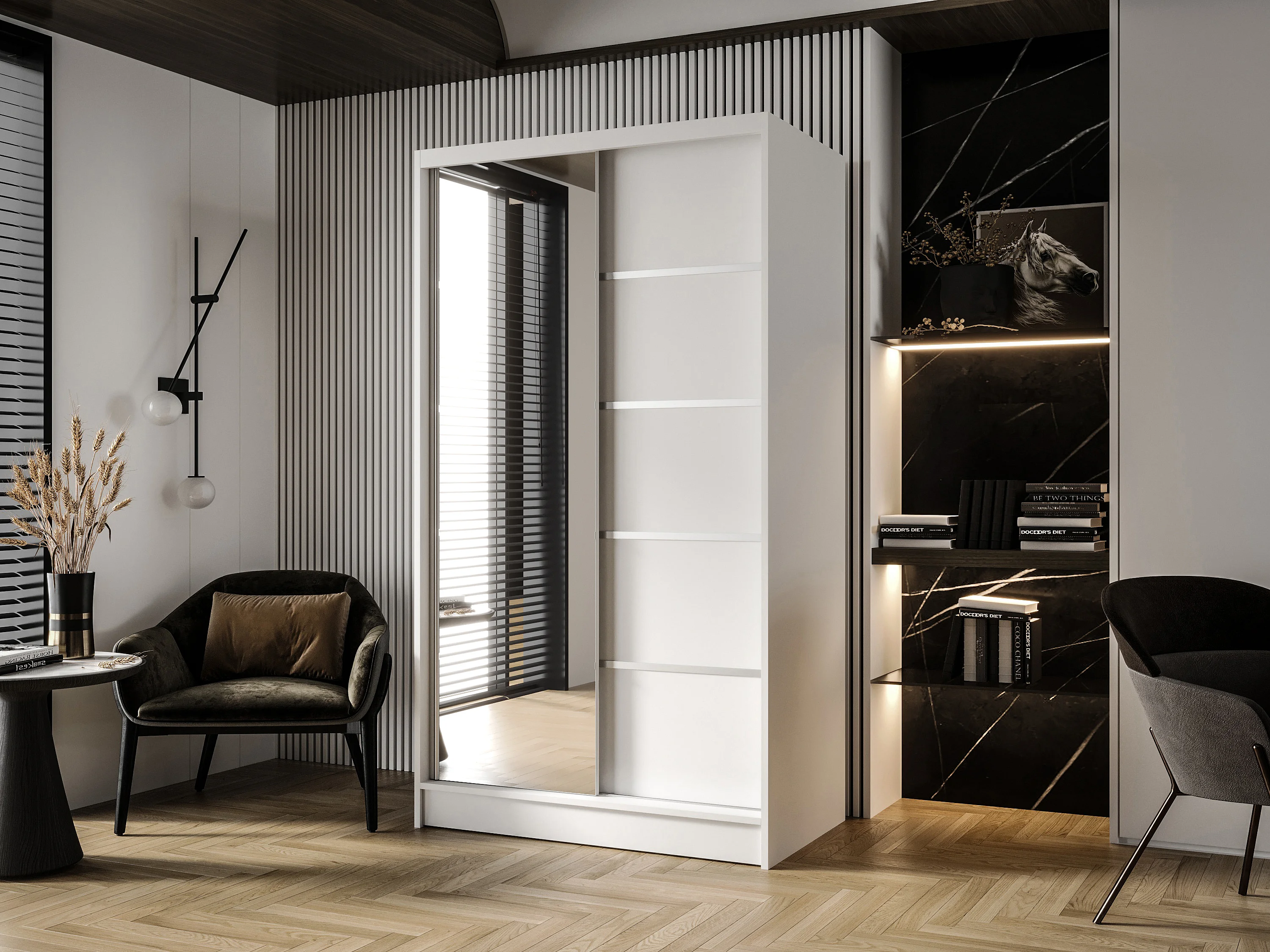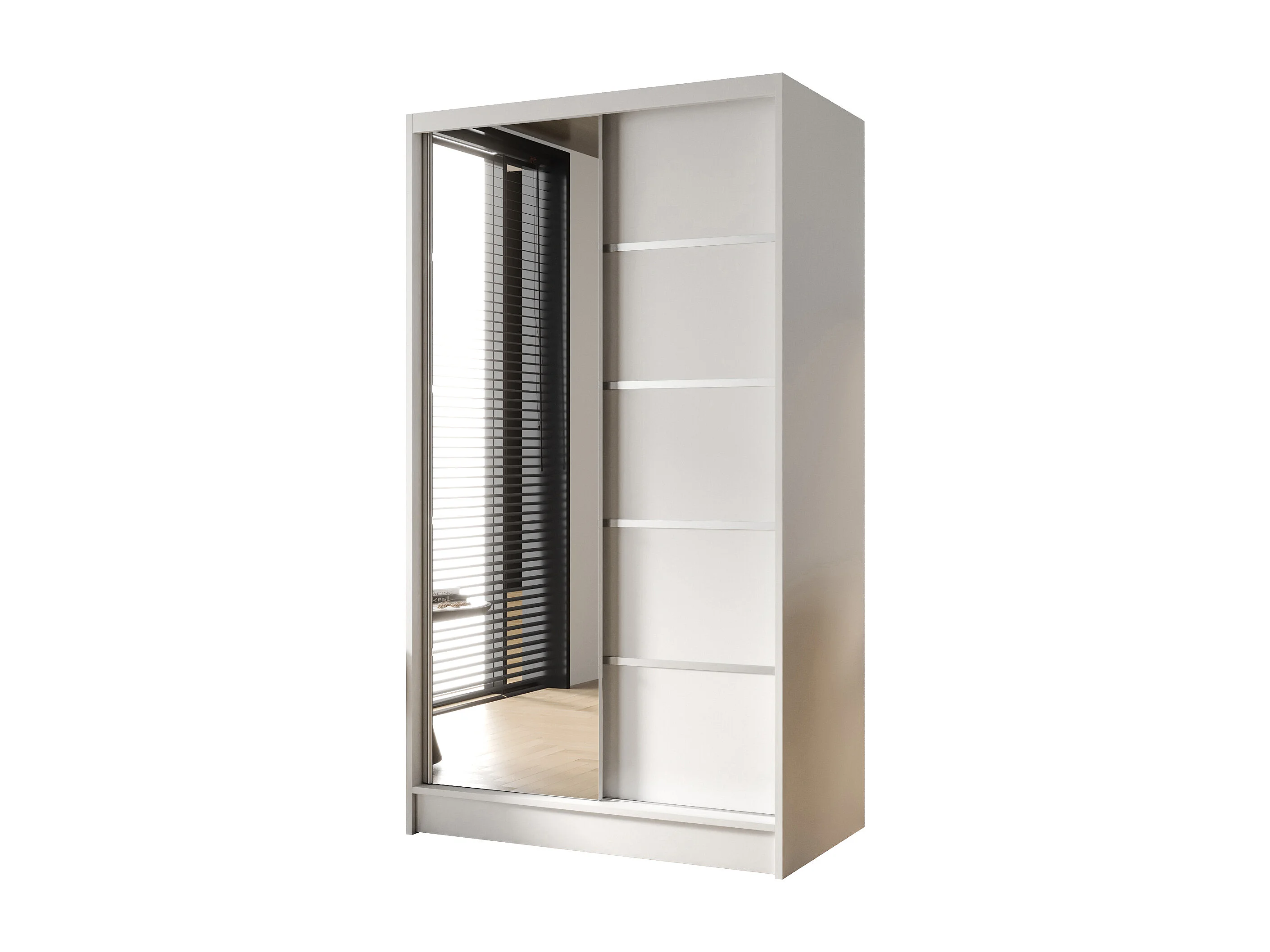 Zweitüriger Schiebeschrank mit Spiegel DETROIT D3, Regalböden und Kleiderstange (Weiß)