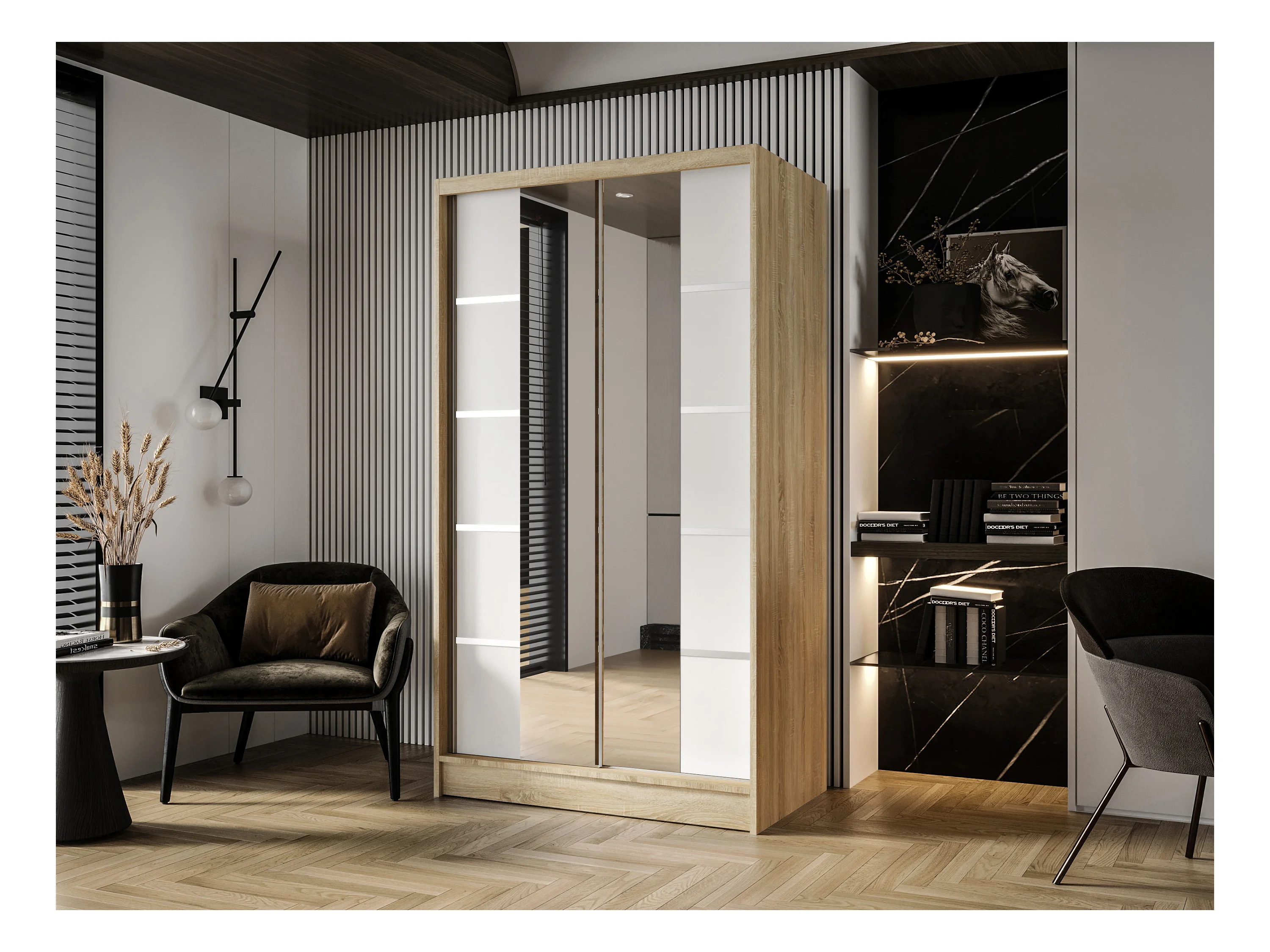 Zweitüriger Schiebeschrank mit Spiegel DETROIT D5, Regalböden und Kleiderstange (Sonoma/Weiß)