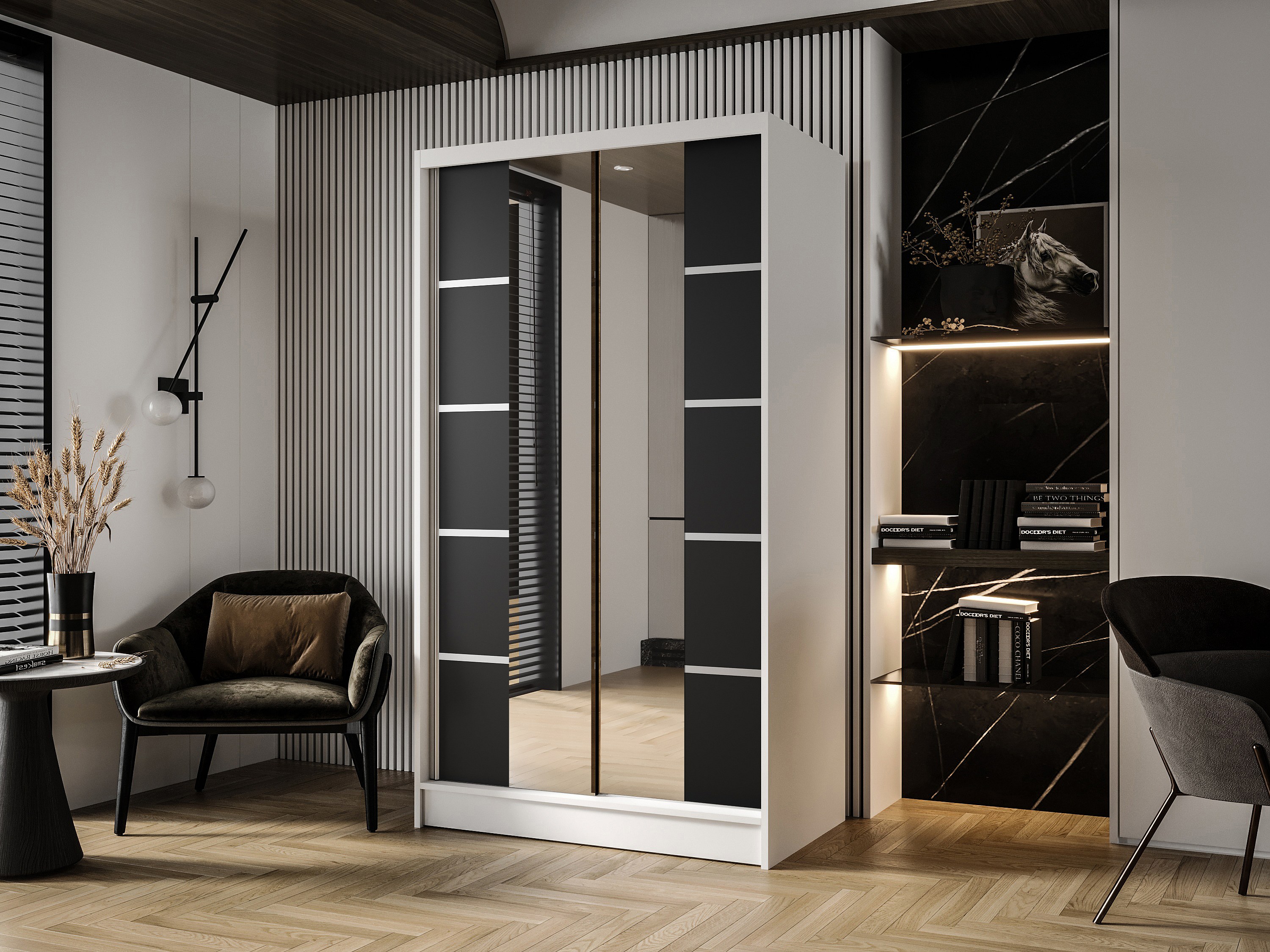 Zweitüriger Schiebeschrank mit Spiegel DETROIT D5, Regalböden und Kleiderstange (Weiß/Schwarz)