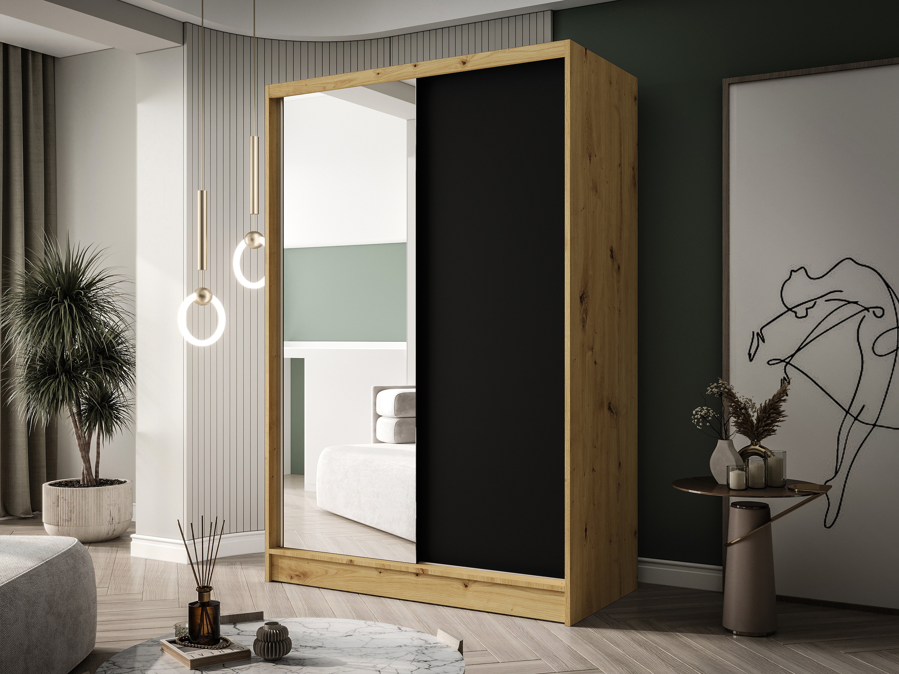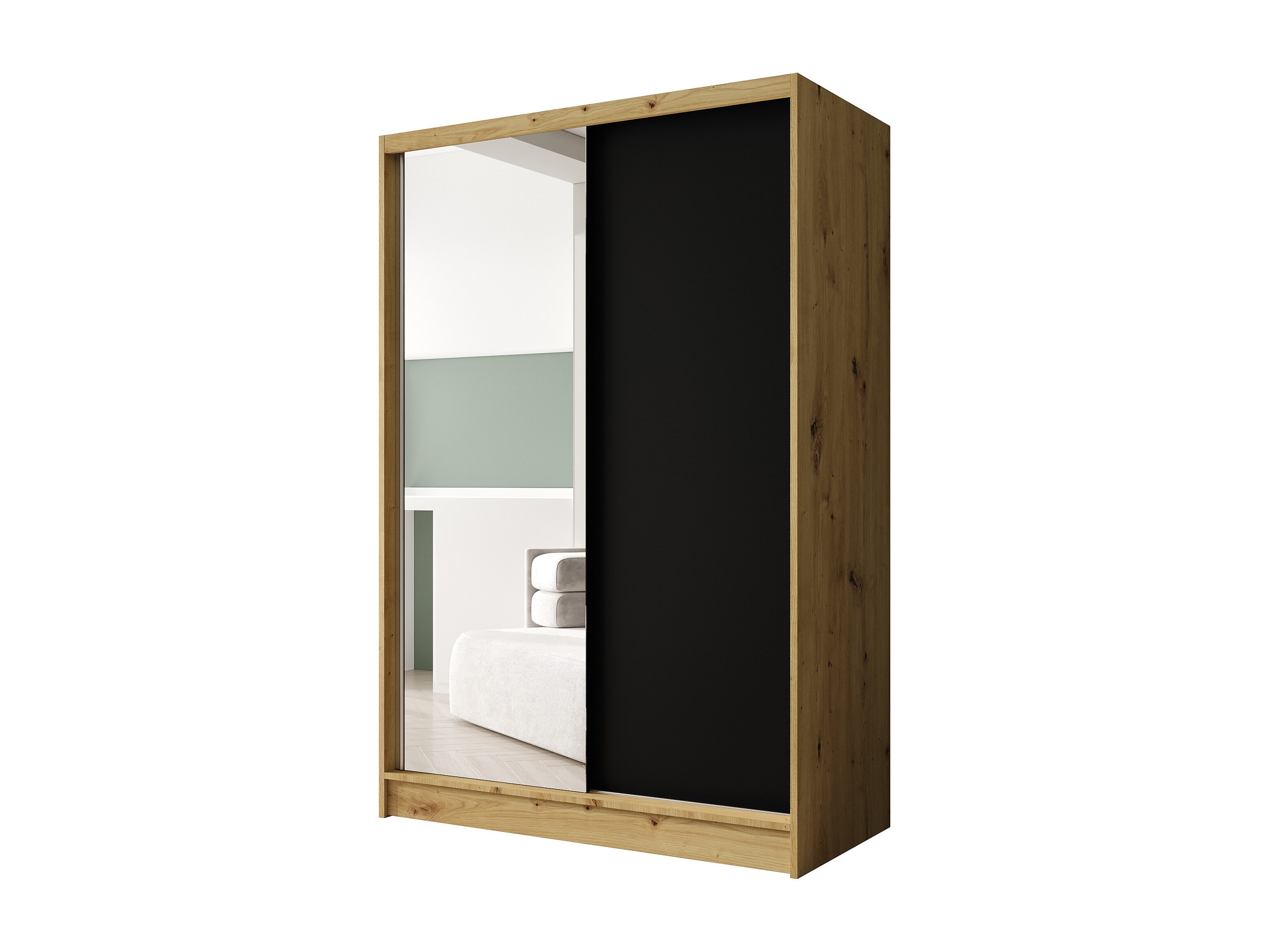 Zweitüriger Schiebeschrank mit Spiegel LAUSANNE L1, Regalböden und Kleiderstange (Artisan/Schwarz)