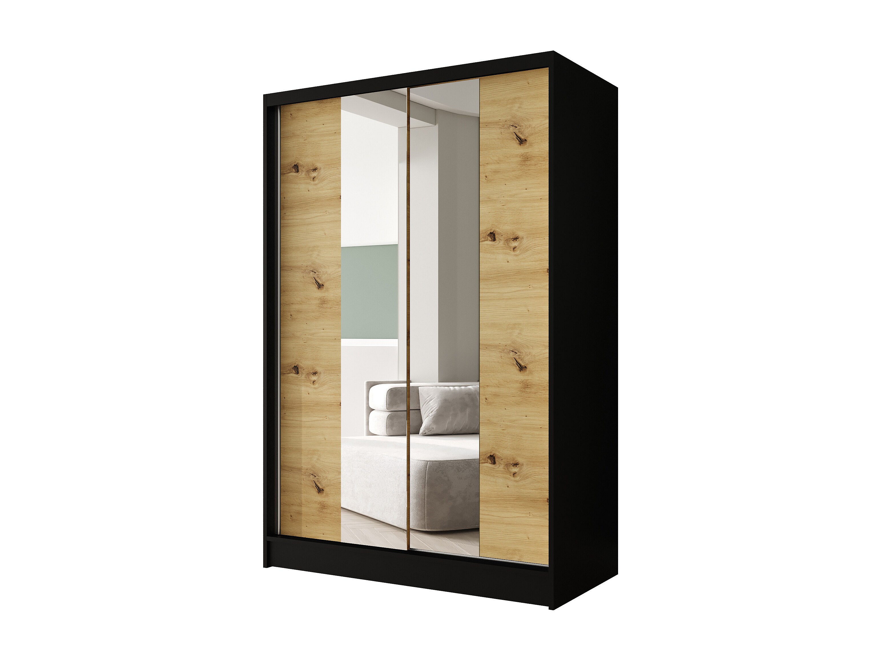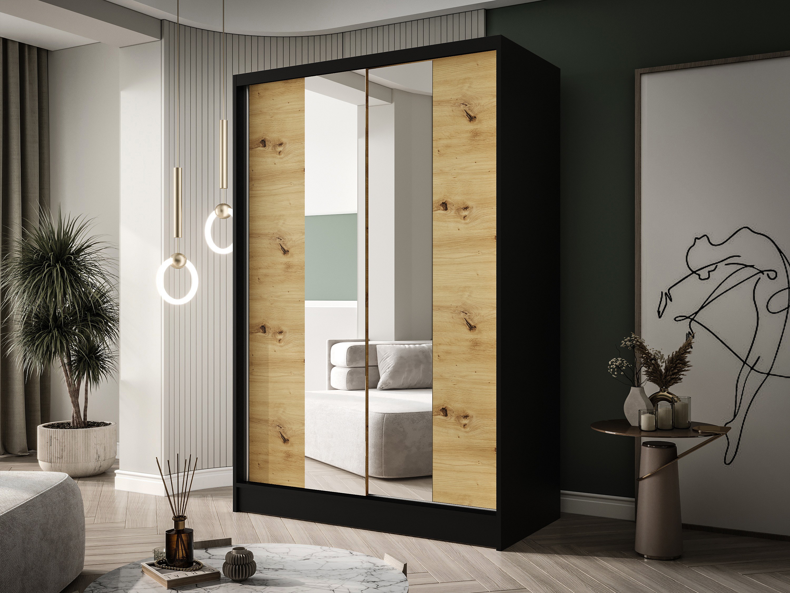 Zweitüriger Schiebeschrank mit Spiegel LAUSANNE L2, Regalböden und Kleiderstange (Schwarz/Artisan)