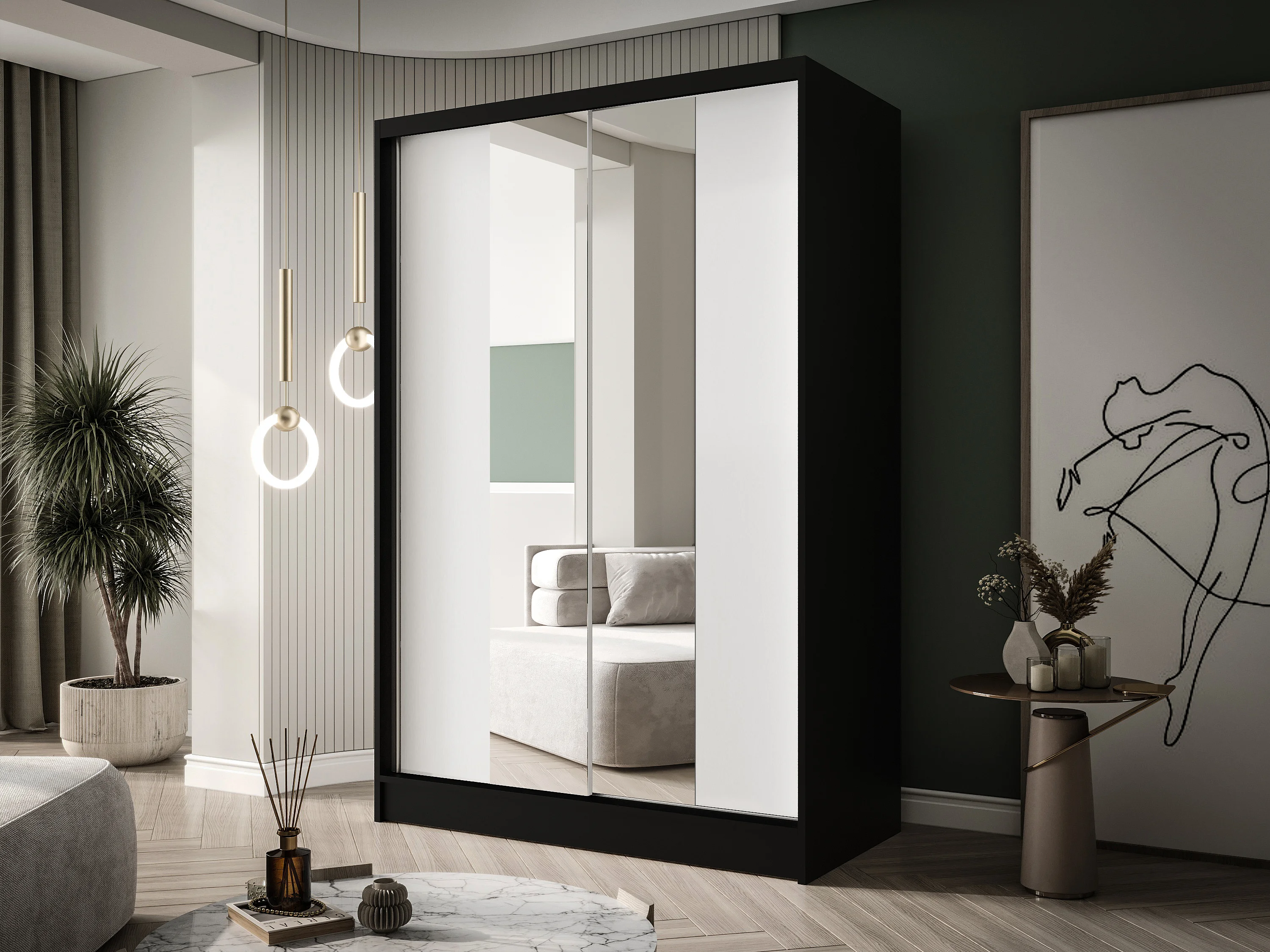 Zweitüriger Schiebeschrank mit Spiegel LAUSANNE L2, Regalböden und Kleiderstange (Schwarz/Weiß)