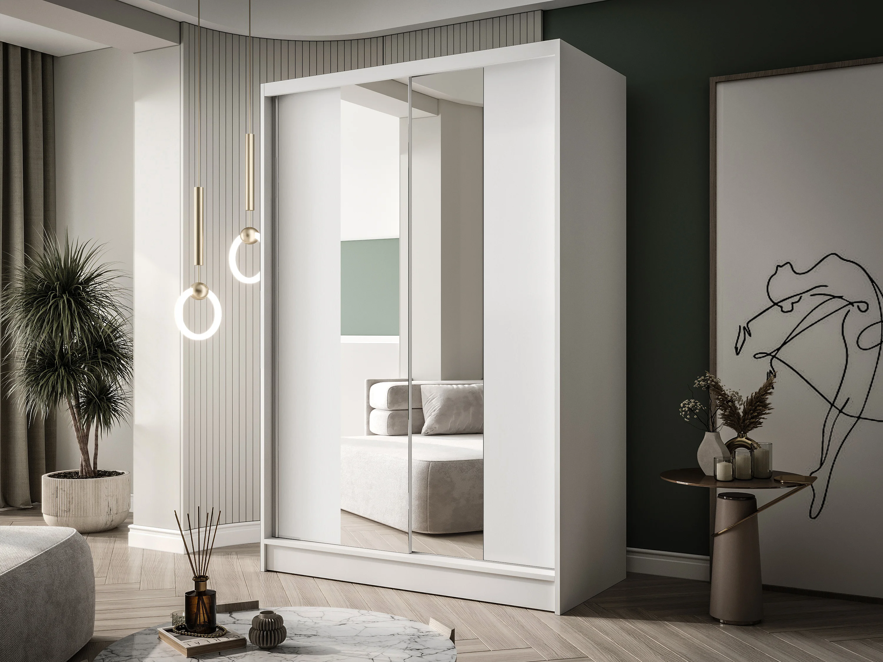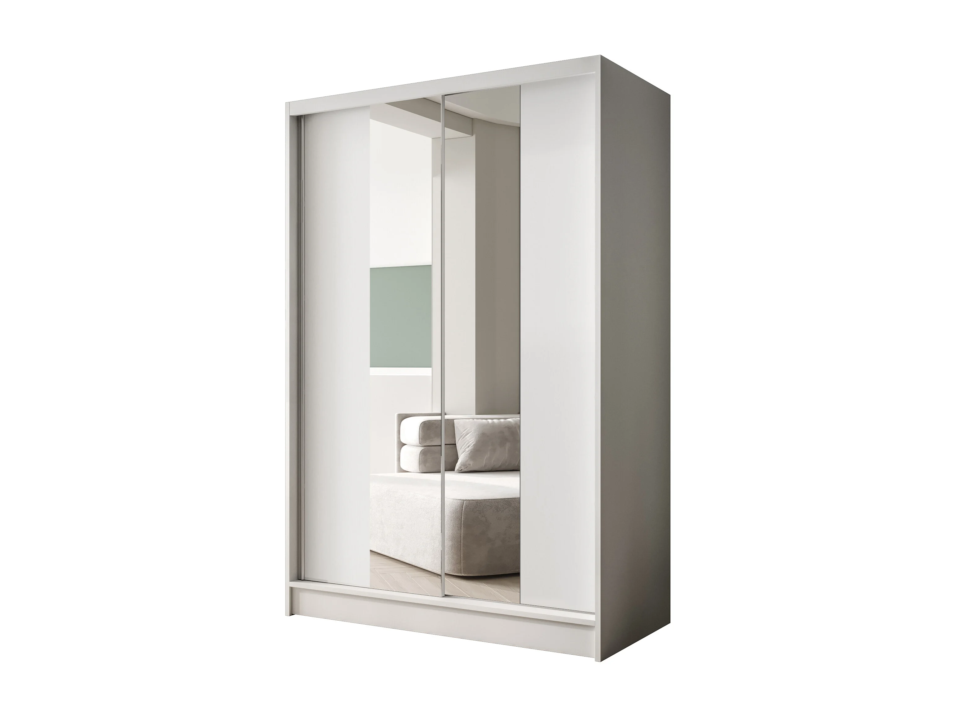 Zweitüriger Schiebeschrank mit Spiegel LAUSANNE L2, Regalböden und Kleiderstange (Weiß)