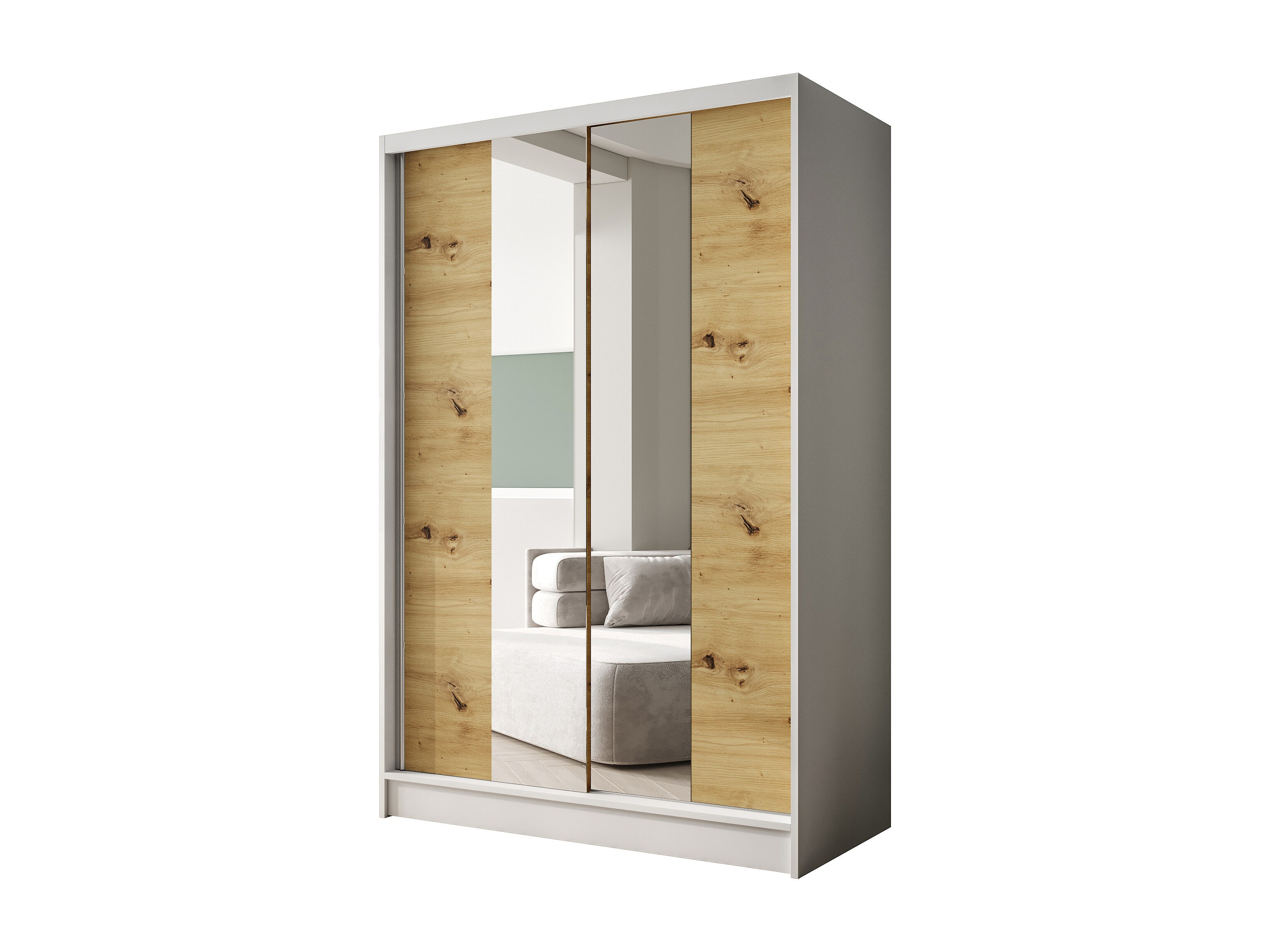 Zweitüriger Schiebeschrank mit Spiegel LAUSANNE L2, Regalböden und Kleiderstange (Weiß/Artisan)