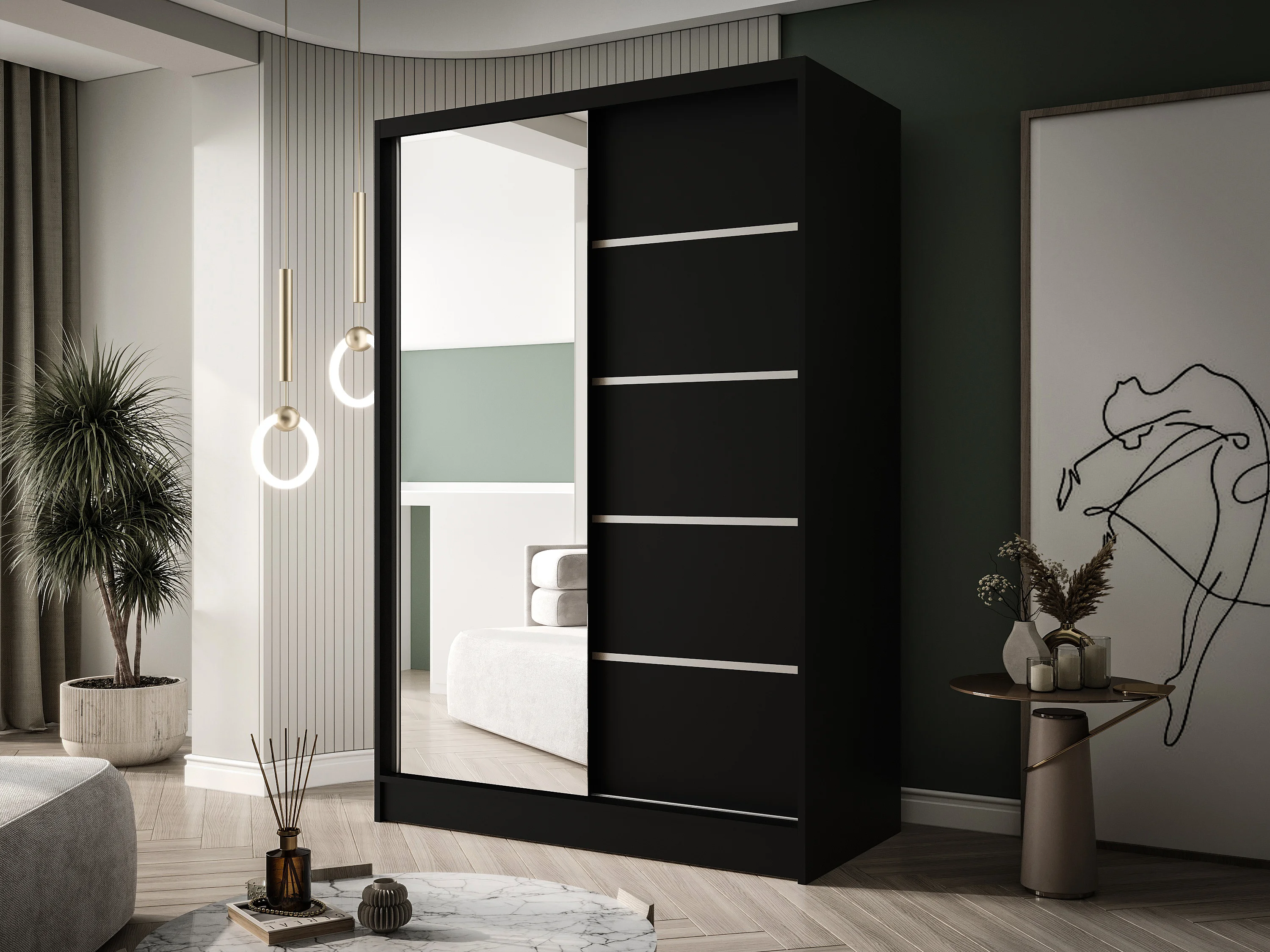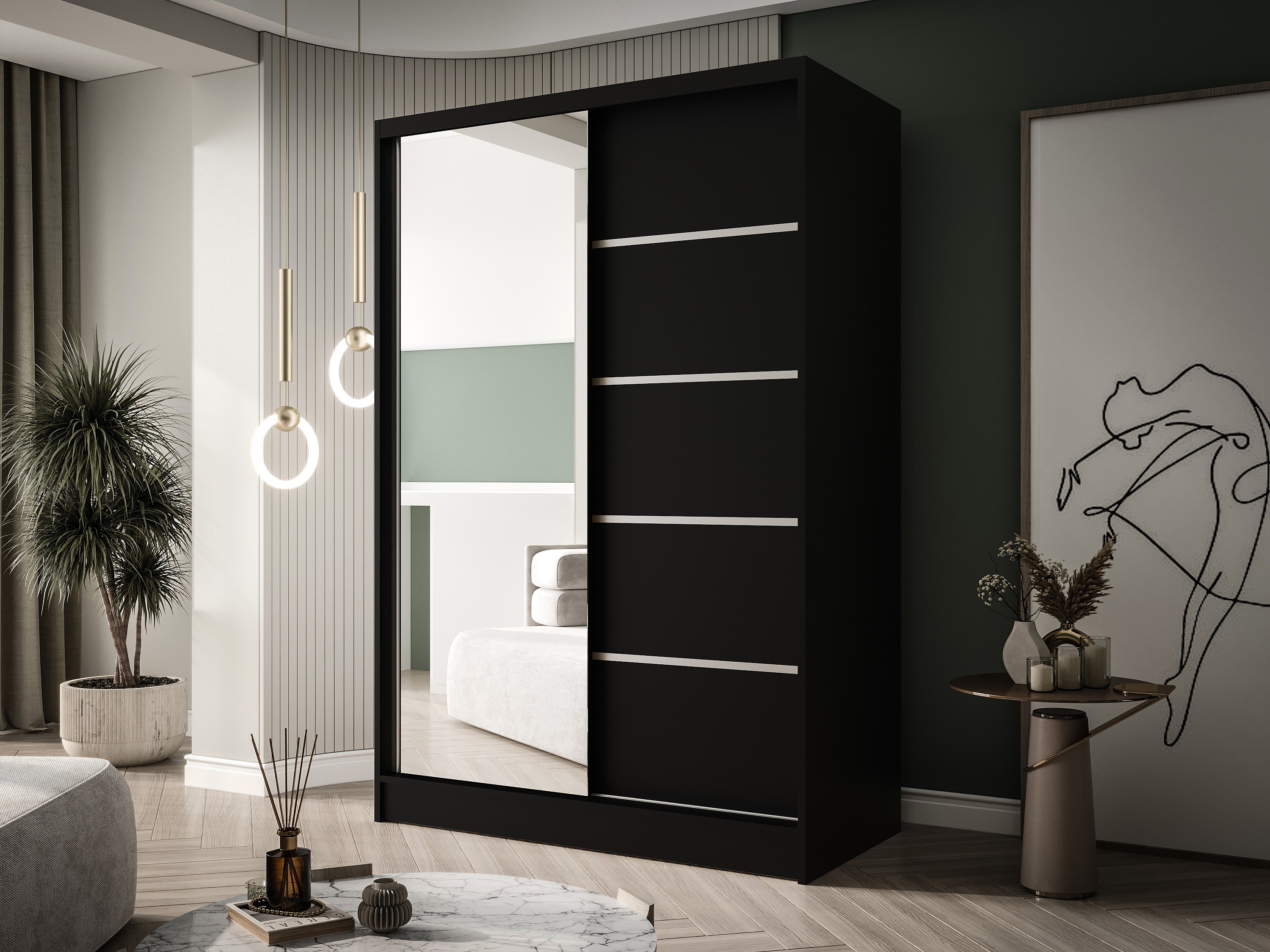 Zweitüriger Schiebeschrank mit Spiegel LAUSANNE L3, Regalböden und Kleiderstange (Schwarz)