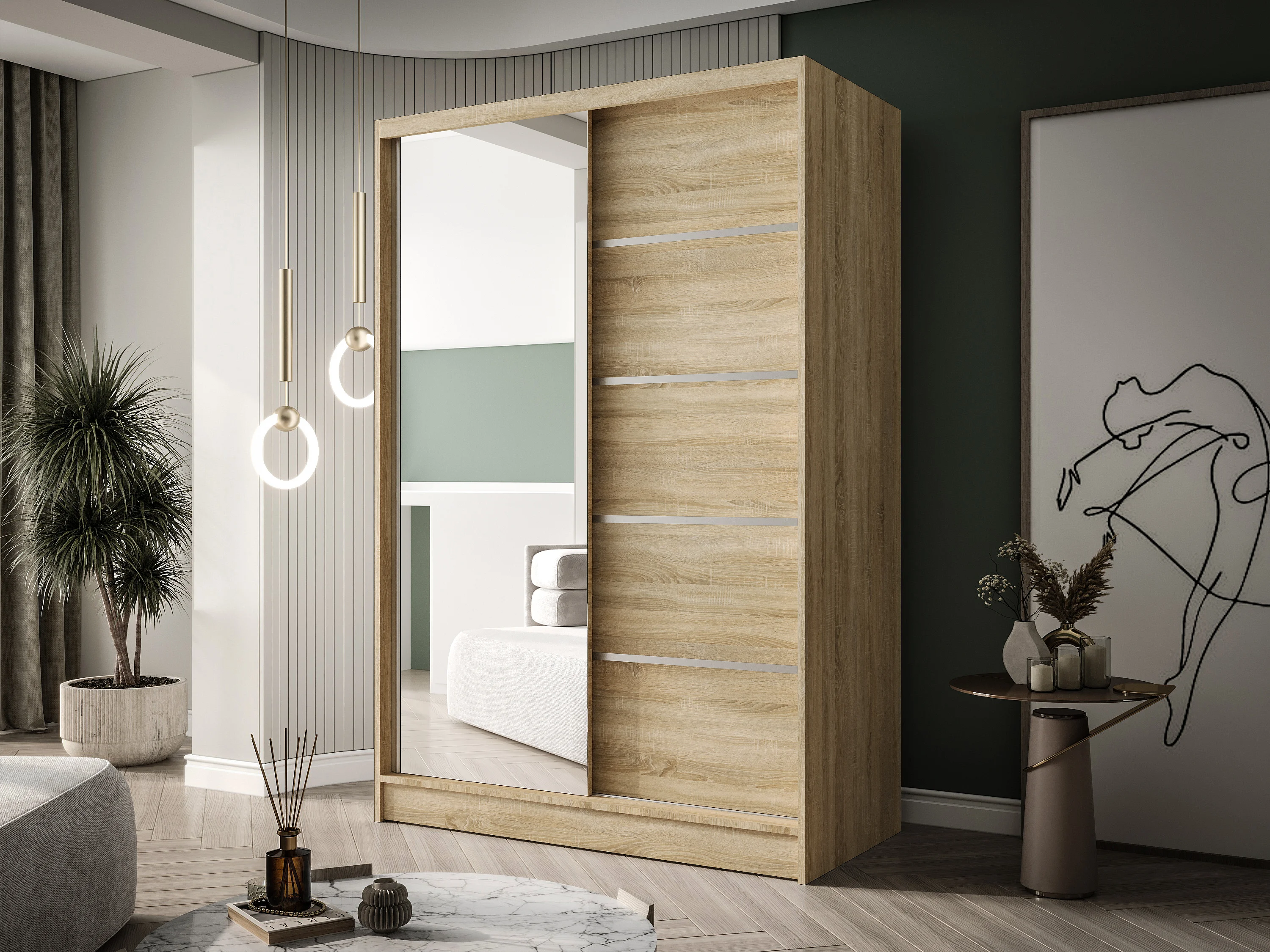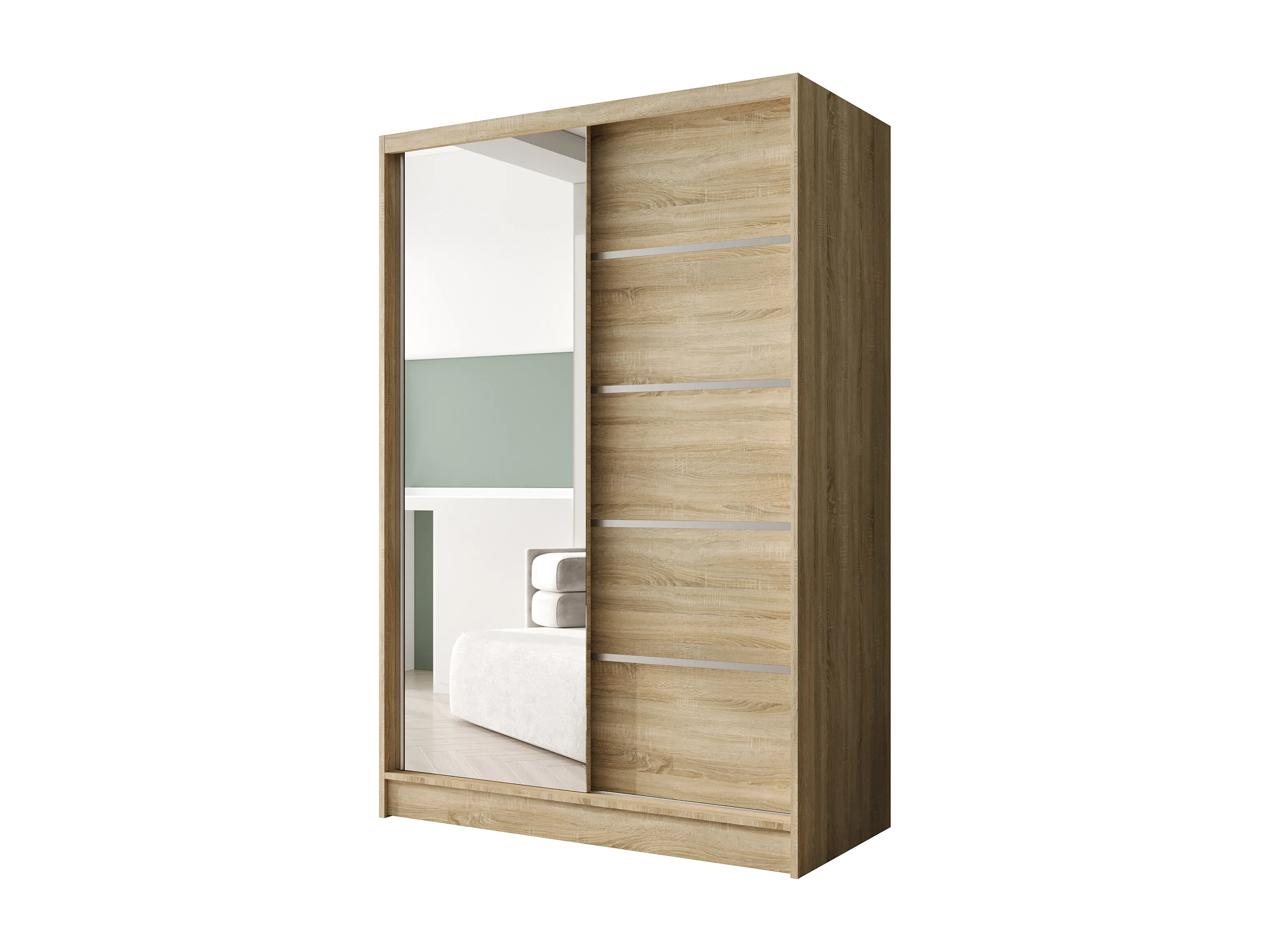 Zweitüriger Schiebeschrank mit Spiegel LAUSANNE L3, Regalböden und Kleiderstange (Sonoma)