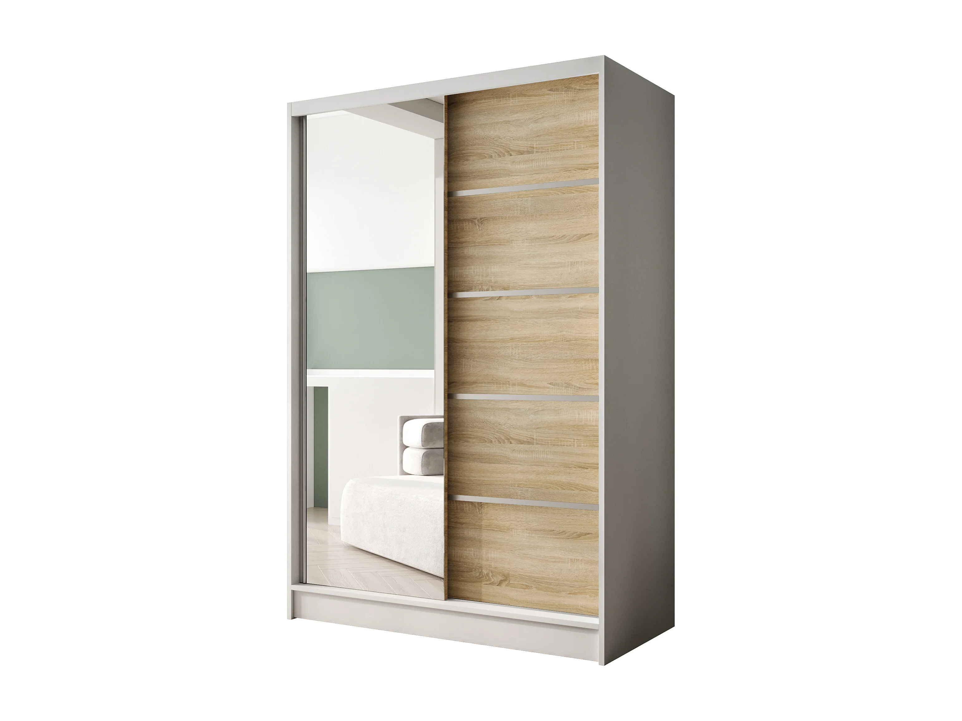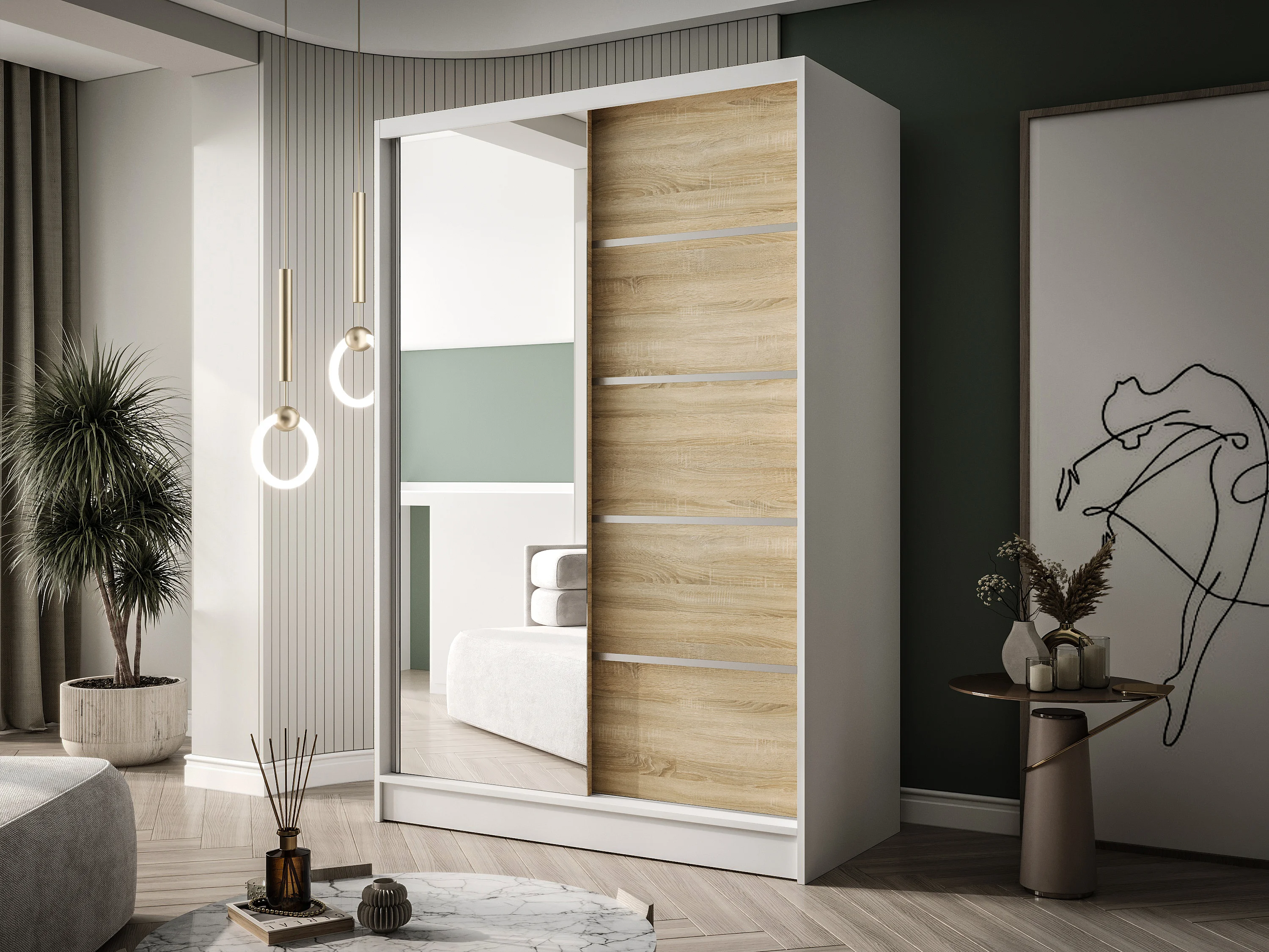 Zweitüriger Schiebeschrank mit Spiegel LAUSANNE L3, Regalböden und Kleiderstange (Weiß/Sonoma)