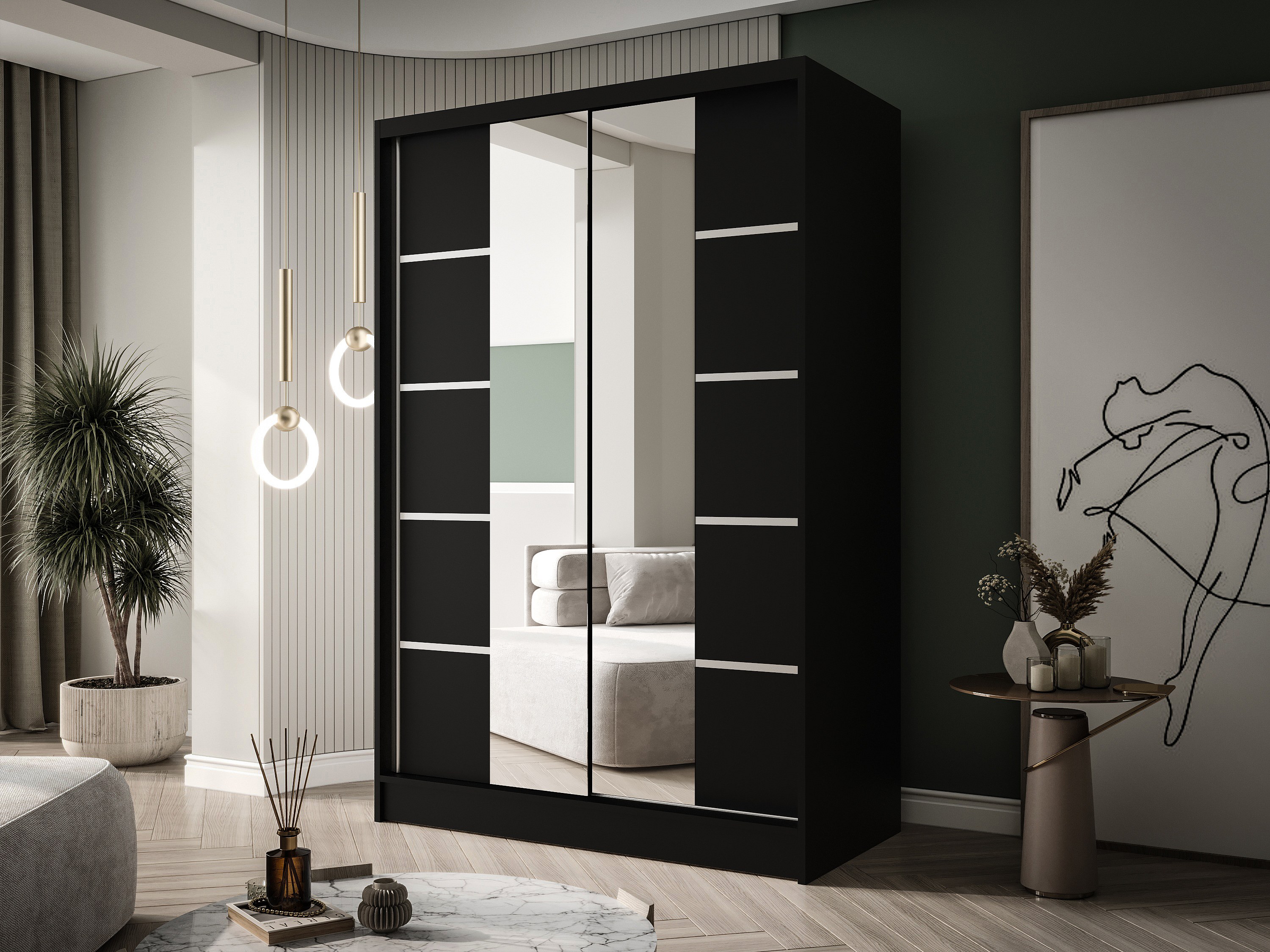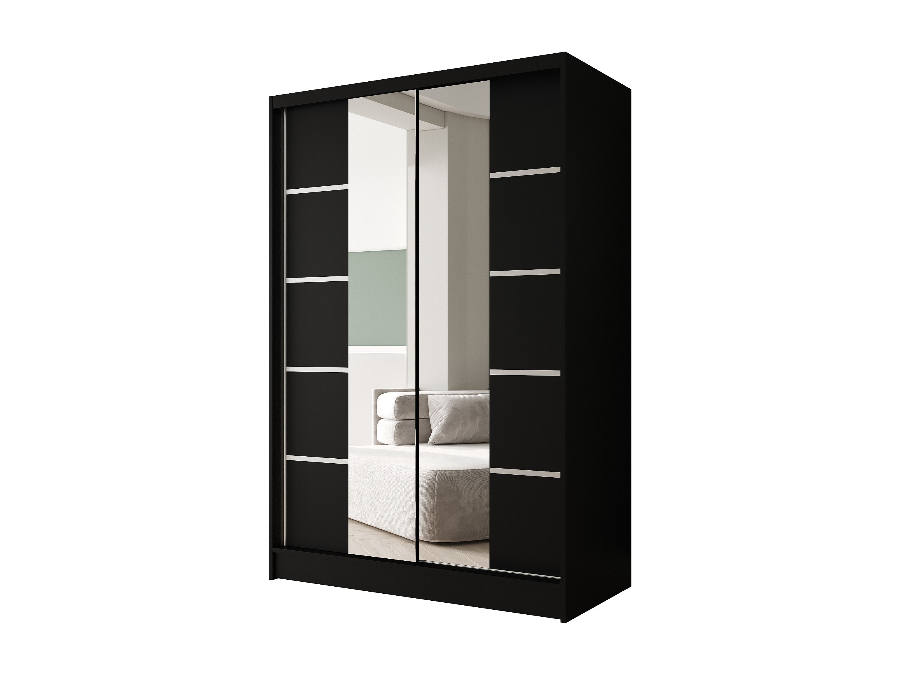 Zweitüriger Schiebeschrank mit Spiegel LAUSANNE L5, Regalböden und Kleiderstange (Schwarz)